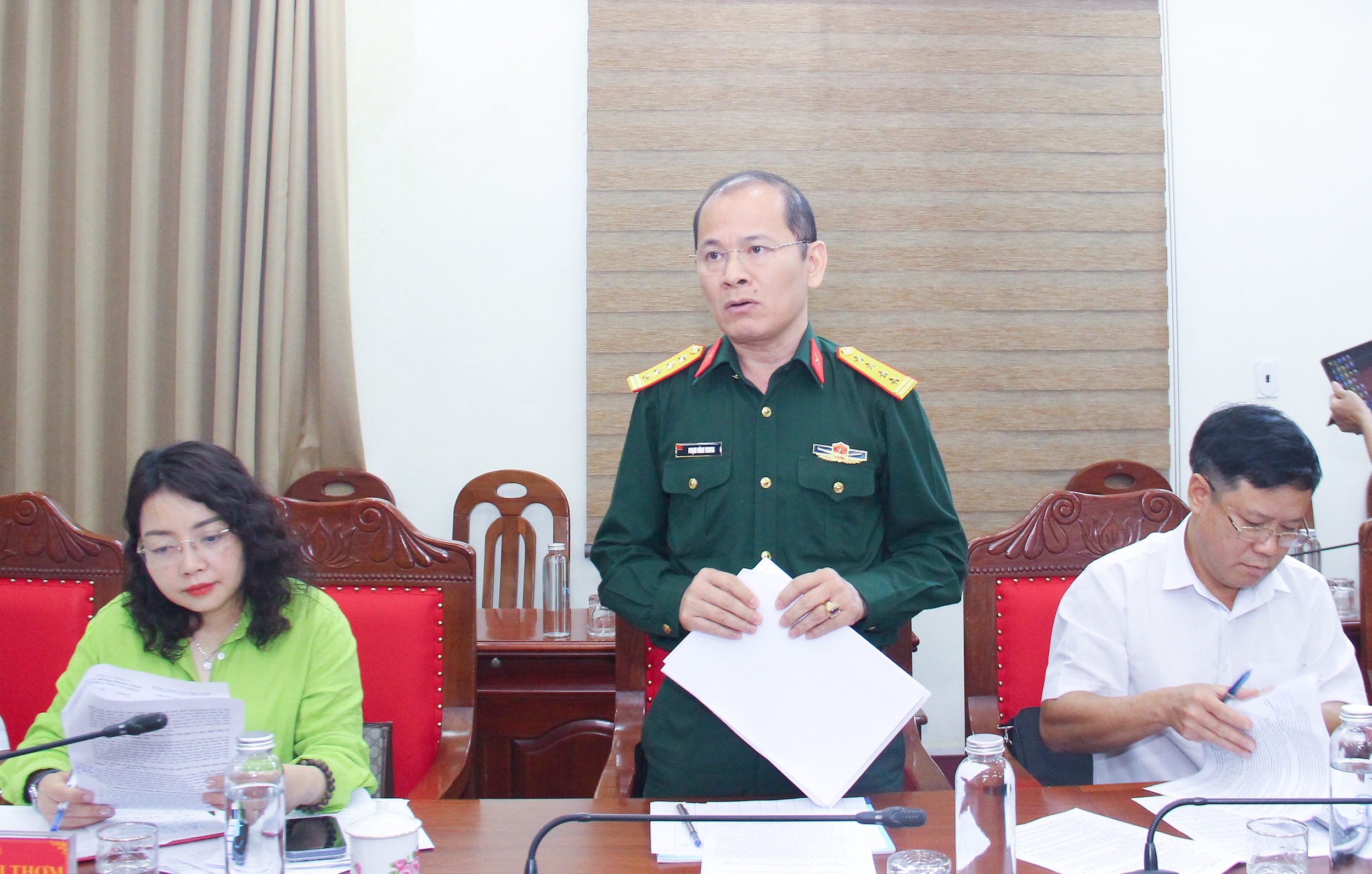 Đại tá Phạm Đình Trung - Phó Chính ủy Bộ Chỉ huy Quân sự tỉnh, thành viên Ban Chỉ đạo nêu một số kinh nghiệm trong phong trào "Dân vận khéo" của lực lượng vũ trang. Ảnh: Mai Hoa