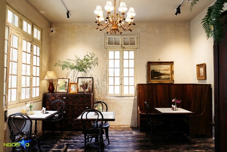 Lên đến tầng hai, không gian chuyển sang tông màu trầm ấm của gỗ và ánh đèn vàng dịu nhẹ. Những bức tường loang màu cổ kính, đèn chùm treo trần và chiếc đàn piano gỗ đặt cạnh kệ trang trí nghệ thuật tạo nên không gian hoài niệm. Hệ thống cửa sổ lớn chạy dọc hai bên tường giúp căn phòng luôn tràn ngập ánh sáng tự nhiên.