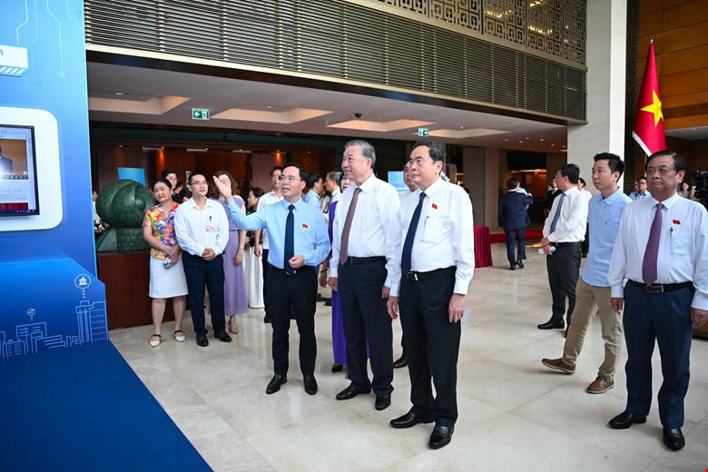 Đại biểu Trần Văn Khải giới thiệu với Tổng Bí thư Tô Lâm, Chủ tịch Quốc hội Trần Thanh Mẫn cùng các đại biểu về kết quả chuyển đổi số của Quốc hội bên lề Hội nghị.