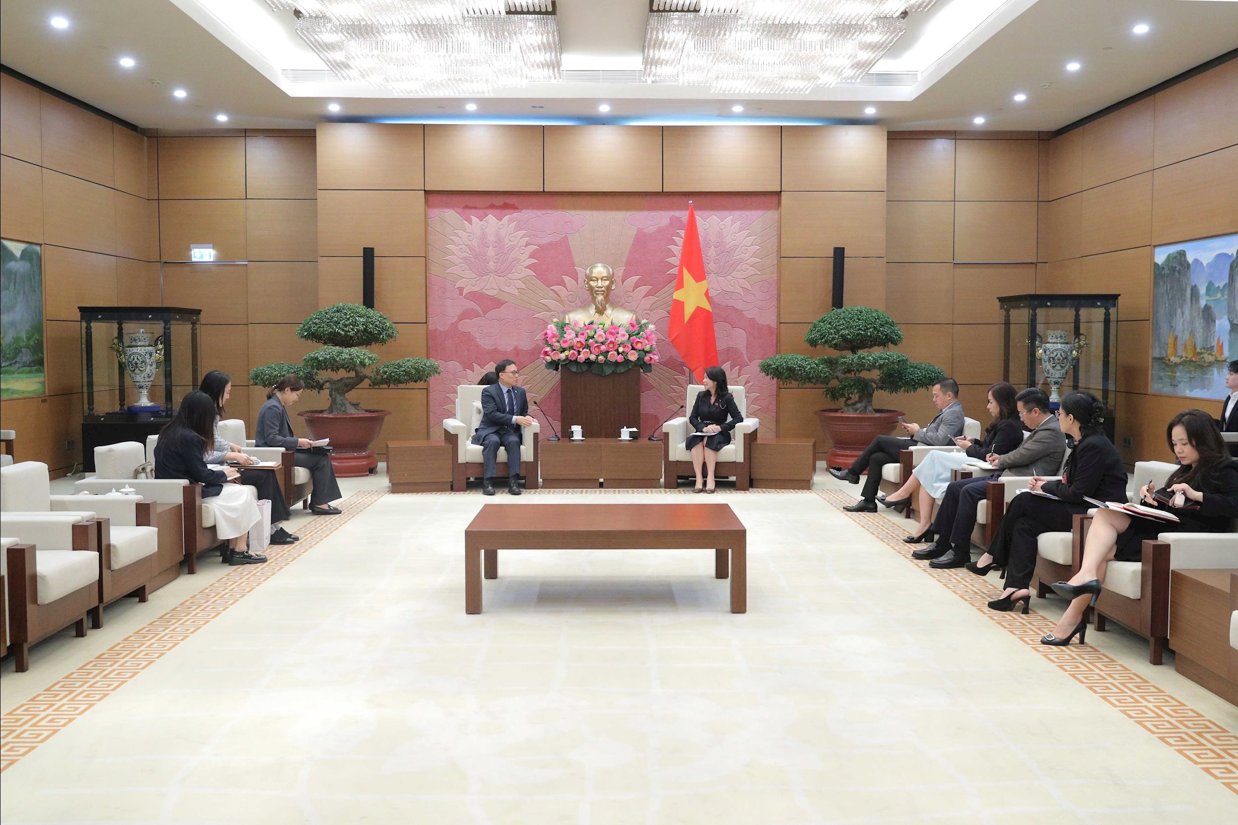 Tại cuộc tiếp, Phó Chủ nhiệm Văn phòng Quốc hội Lê Thu Hà và Đại sứ Hàn Quốc tại Việt Nam Choi Young Sam chia sẻ thông tin về trao đổi đoàn cấp cao trong thời gian tới.