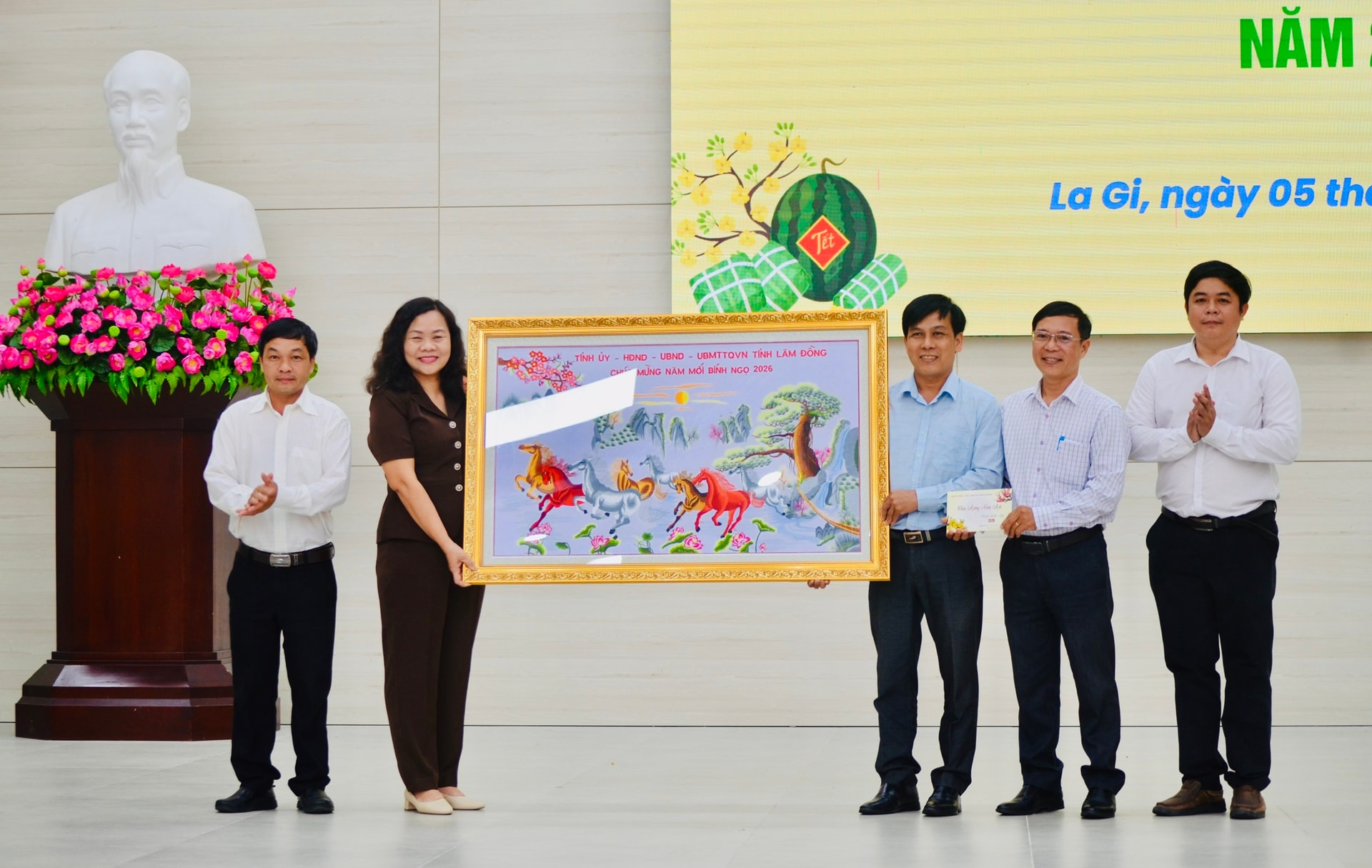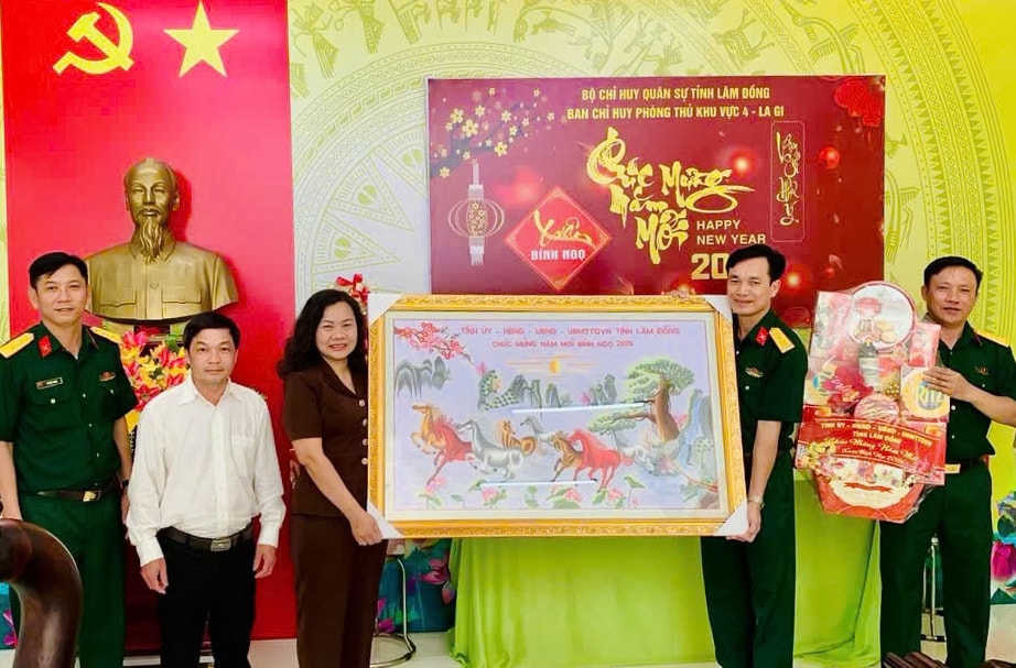Đoàn công tác đã đến thăm, chúc Tết và tặng quà Ban Chỉ huy PTKV4 - La Gi. Tại đây, đồng chí Nguyễn Thị Thuận Bích ghi nhận, biểu dương tinh thần trách nhiệm, sự nỗ lực của cán bộ, chiến sĩ trong công tác sẵn sàng chiến đấu, giữ vững an ninh chính trị, trật tự an toàn xã hội trên địa bàn; đồng thời động viên đơn vị tiếp tục phát huy truyền thống, hoàn thành tốt nhiệm vụ được giao, đảm bảo cho Nhân dân vui Xuân, đón Tết an toàn.