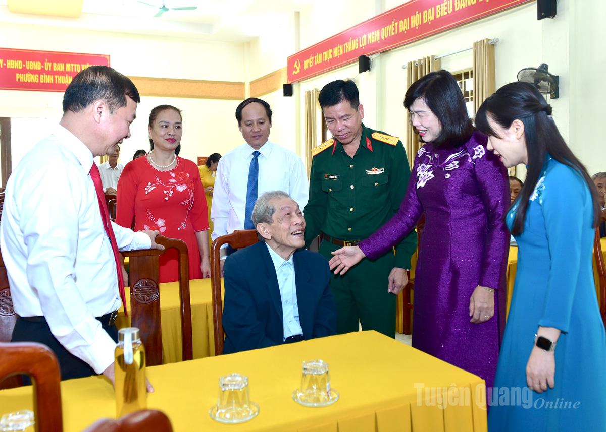 Phó Chủ tịch HĐND tỉnh Phạm Thị Minh Xuân cùng lãnh đạo phường Bình Thuận trò chuyện với các đảng viên được trao tặng Huy hiệu Đảng dịp 7-11.