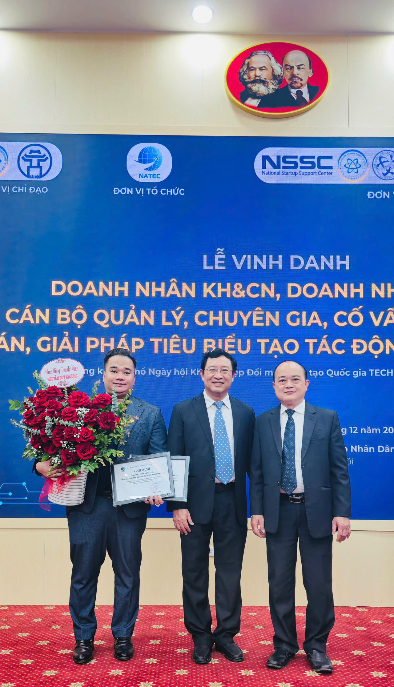 Ông Nguyễn Duy Khương - Phó Chủ tịch Hội Doanh nhân trẻ Đồng Nai - chụp hình lưu niệm cùng ông Phạm Hồng Quất - Cục trưởng Cục Khởi nghiệp và Doanh nghiệp công nghệ (Bộ KH&CN) - người đứng giữa tại Lễ vinh danh.