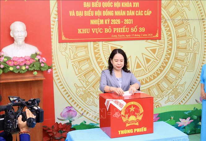 Phó Chủ tịch nước Võ Thị Ánh Xuân bỏ phiếu bầu cử tại khu vực bỏ phiếu số 39, phường Long Xuyên, An Giang.