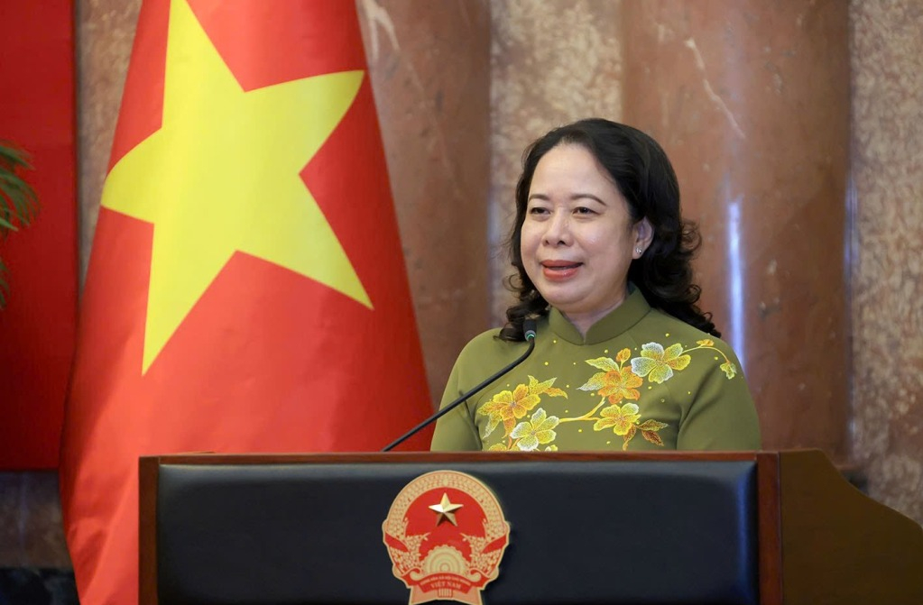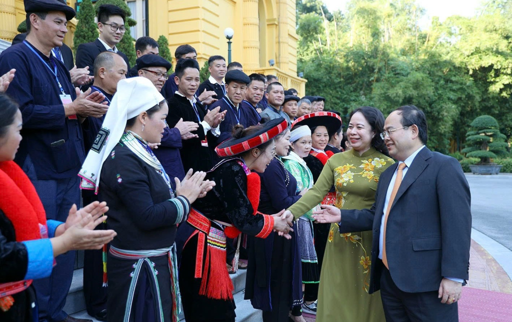 Phó Chủ tịch nước Võ Thị Ánh Xuân chào đón Đoàn đại biểu dân tộc thiểu tiêu biểu tỉnh Cao Bằng tại Phủ Chủ tịch.