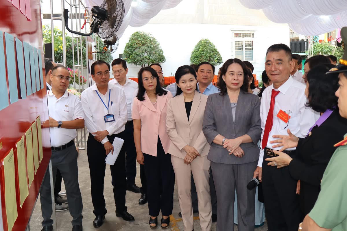 Phó Chủ tịch nước Võ Thị Ánh Xuân cùng các thành viên Đoàn công tác kiểm tra công tác chuẩn bị bầu cử tại Tổ bầu cử số 32 phường Trấn Biên.