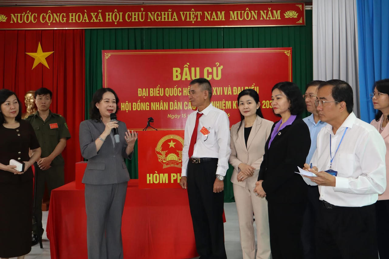 Phó Chủ tịch nước Võ Thị Ánh Xuân kiểm tra ghi nhận và đánh giá cao công tác chuẩn bị tại điểm bầu cử.