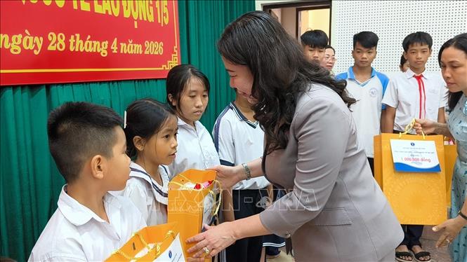 Tại chương trình, Đoàn công tác đã trao bảng tượng trưng 200 suất học bổng của Quỹ Bảo trợ trẻ em Việt Nam tặng học sinh có hoàn cảnh khó khăn; trao 90 phần quà tặng đại diện gia đình chính sách, hộ nghèo, công nhân lao động; 20 phần quà tặng trẻ em có hoàn cảnh khó khăn.
