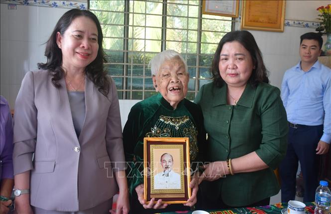 Phó Chủ tịch nước Võ Thị Ánh Xuân thăm tặng quà Mẹ Việt Nam Anh hùng Đặng Thị Biết (sinh năm 1929, xã Hữu Định, tỉnh Vĩnh Long).