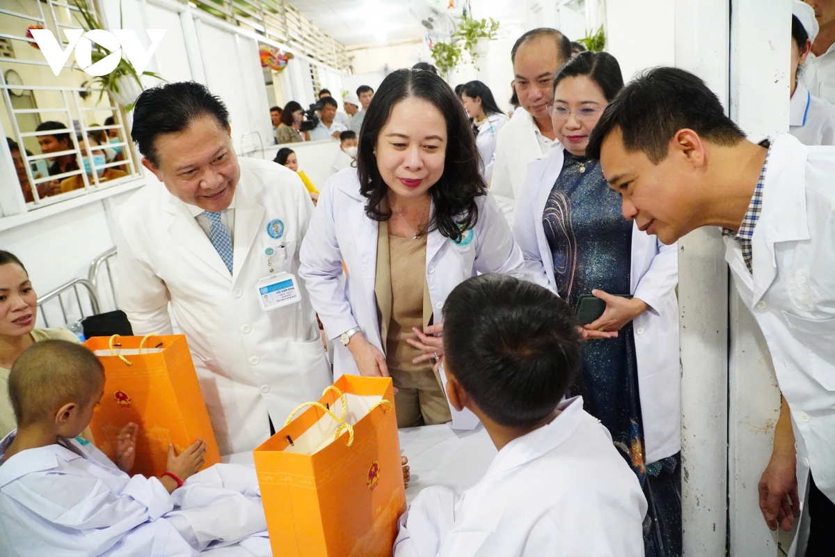 Phó Chủ tịch nước Võ Thị Ánh Xuân cùng đã đoàn công tác đã đến thăm hỏi, tặng quà Trung thu cho các cháu thiếu nhi đang điều trị tại bệnh viện Ung bướu thành phố Cần Thơ (Ảnh: Hồng Phương)
