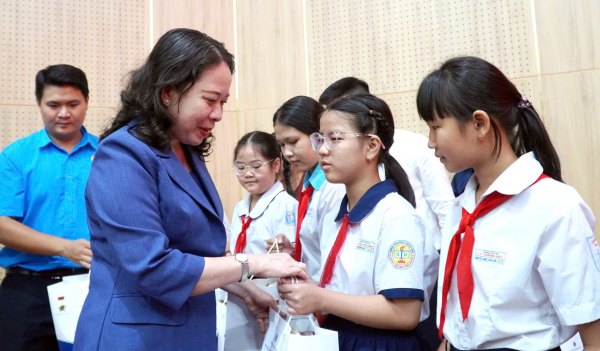 Phó Chủ tịch nước Võ Thị Ánh Xuân tặng quà học sinh vượt khó học giỏi trên địa bàn tỉnh An Giang.