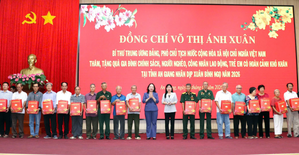 Tại hội trường Tỉnh ủy An Giang, Phó Chủ tịch nước Võ Thị Ánh Xuân cùng Đoàn công tác đã trao 600 phần quà tặng các gia đình chính sách, các hộ gia đình khó khăn và công nhân lao động có hoàn cảnh khó khăn; tặng 200 triệu đồng hỗ trợ trẻ em nghèo vượt khó trên địa bàn tỉnh An Giang.