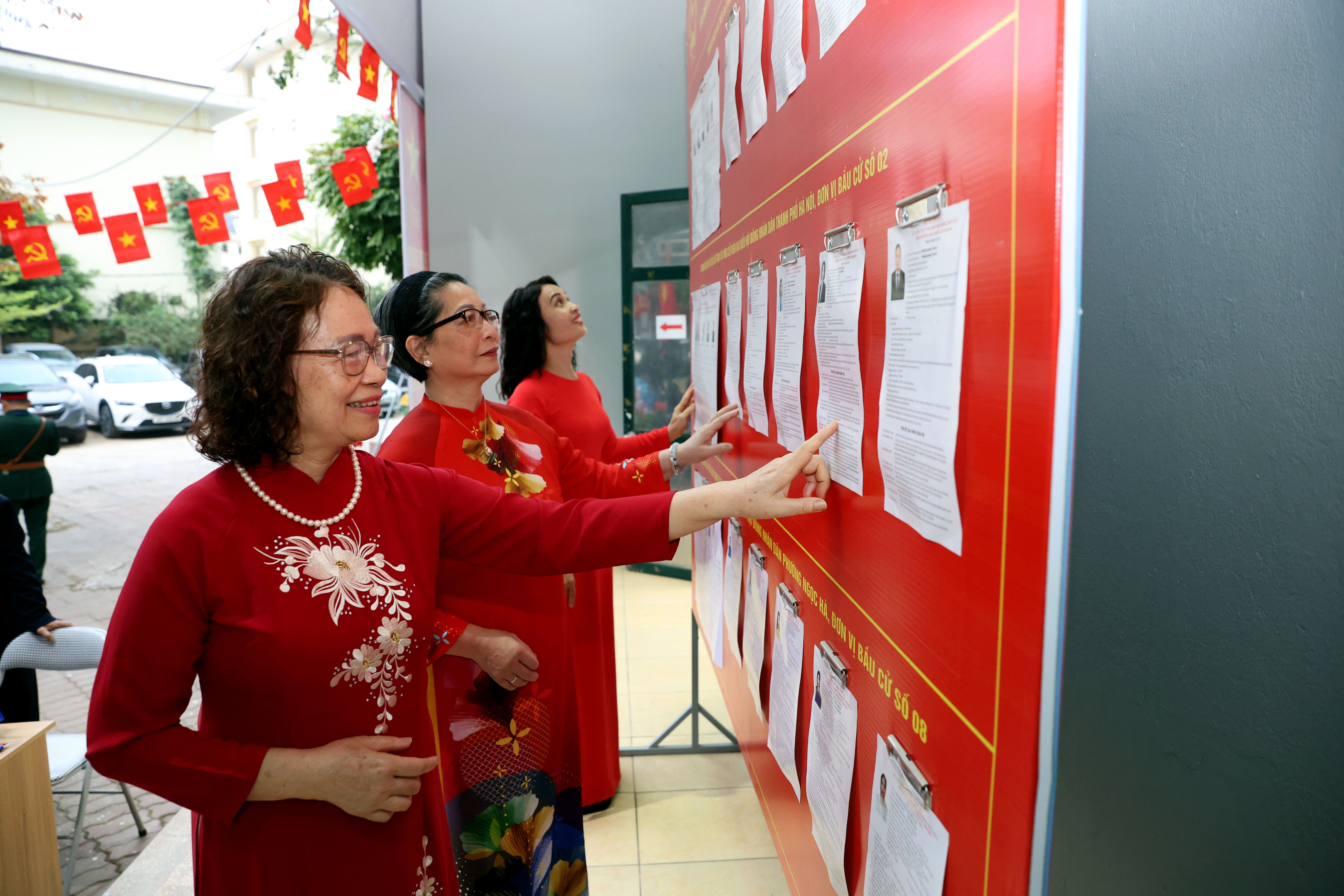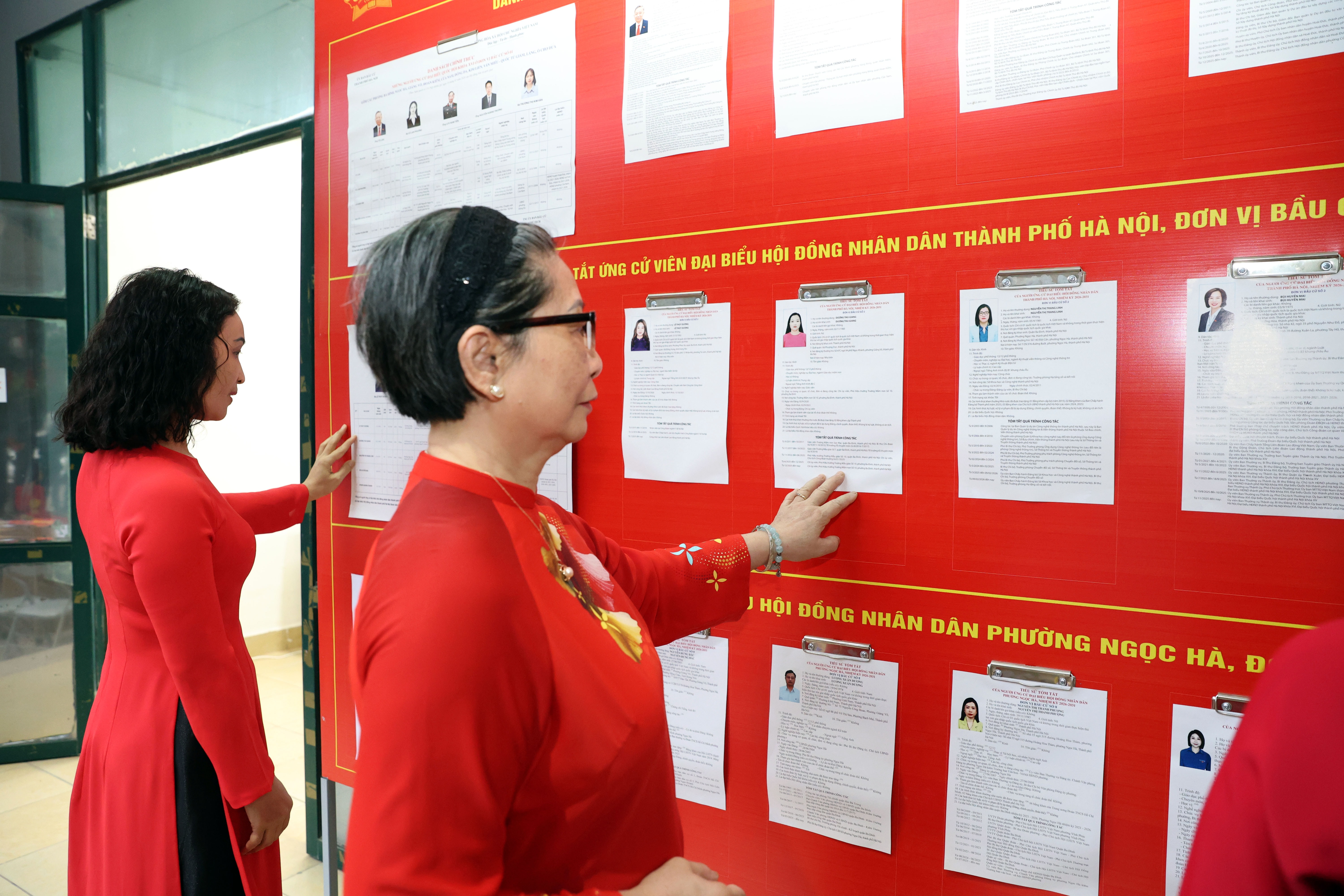 Các cử tri xem danh sách và tiểu sử tóm tắt ứng cử viên trước khi bỏ phiếu tại Khu vực bỏ phiếu số 21, phường Ngọc Hà, Hà Nội