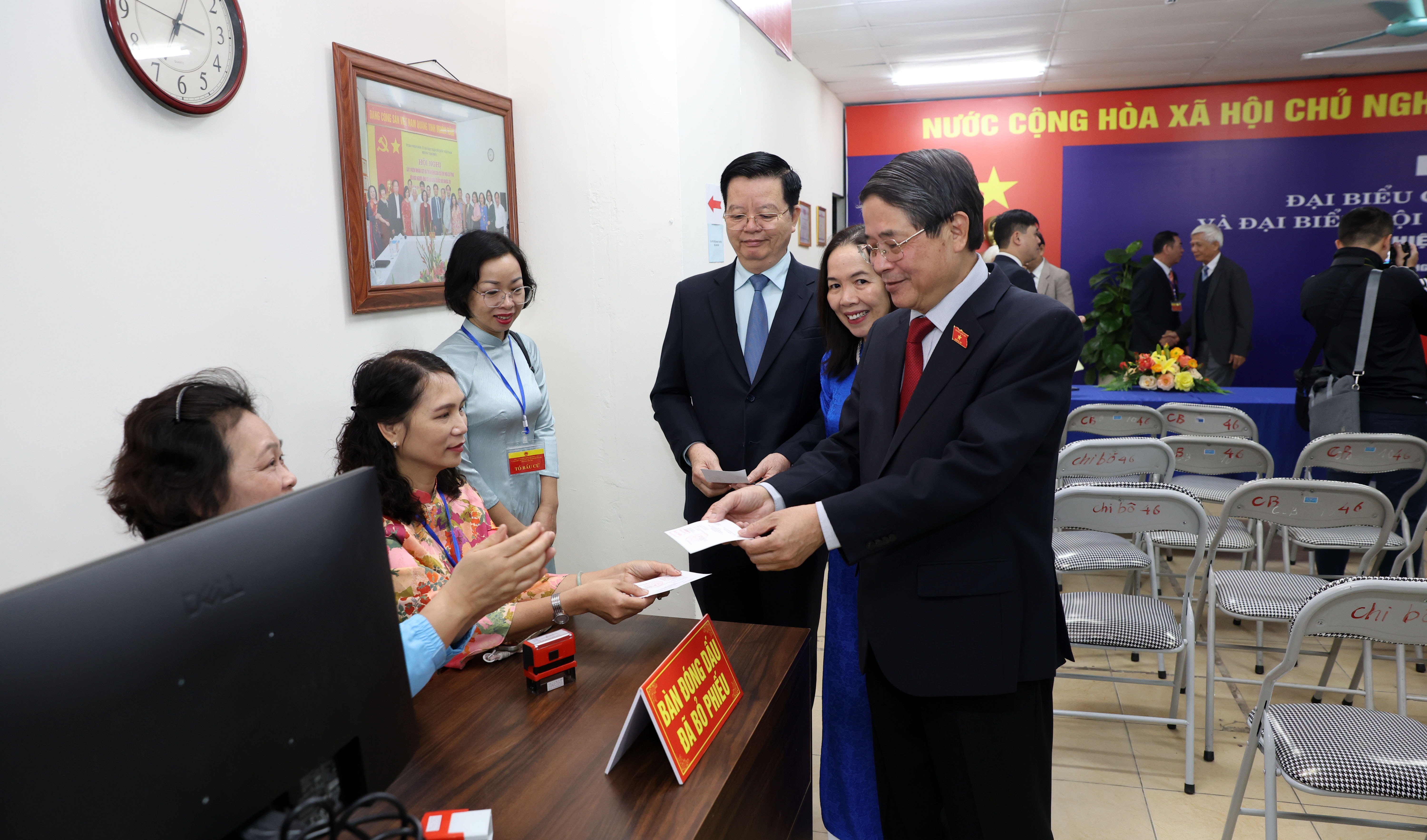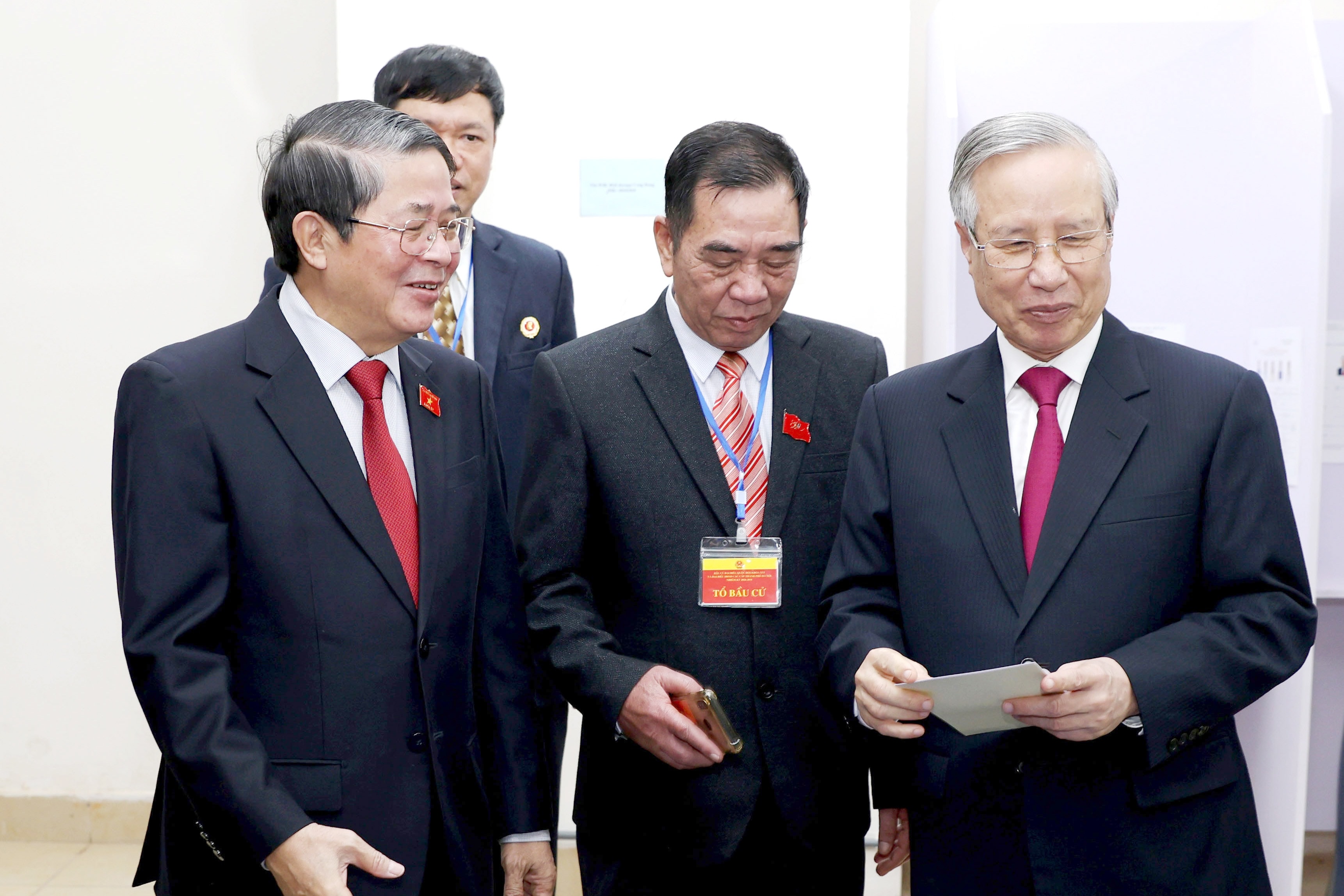 Cùng dự có: nguyên Ủy viên Bộ Chính trị, nguyên Thường trực Ban Bí thư Trần Quốc Vượng; Phó Thủ tướng Chính phủ Mai Văn Chính; đông đảo cử tri của Khu vực bỏ phiếu số 21 phường Ngọc Hà.