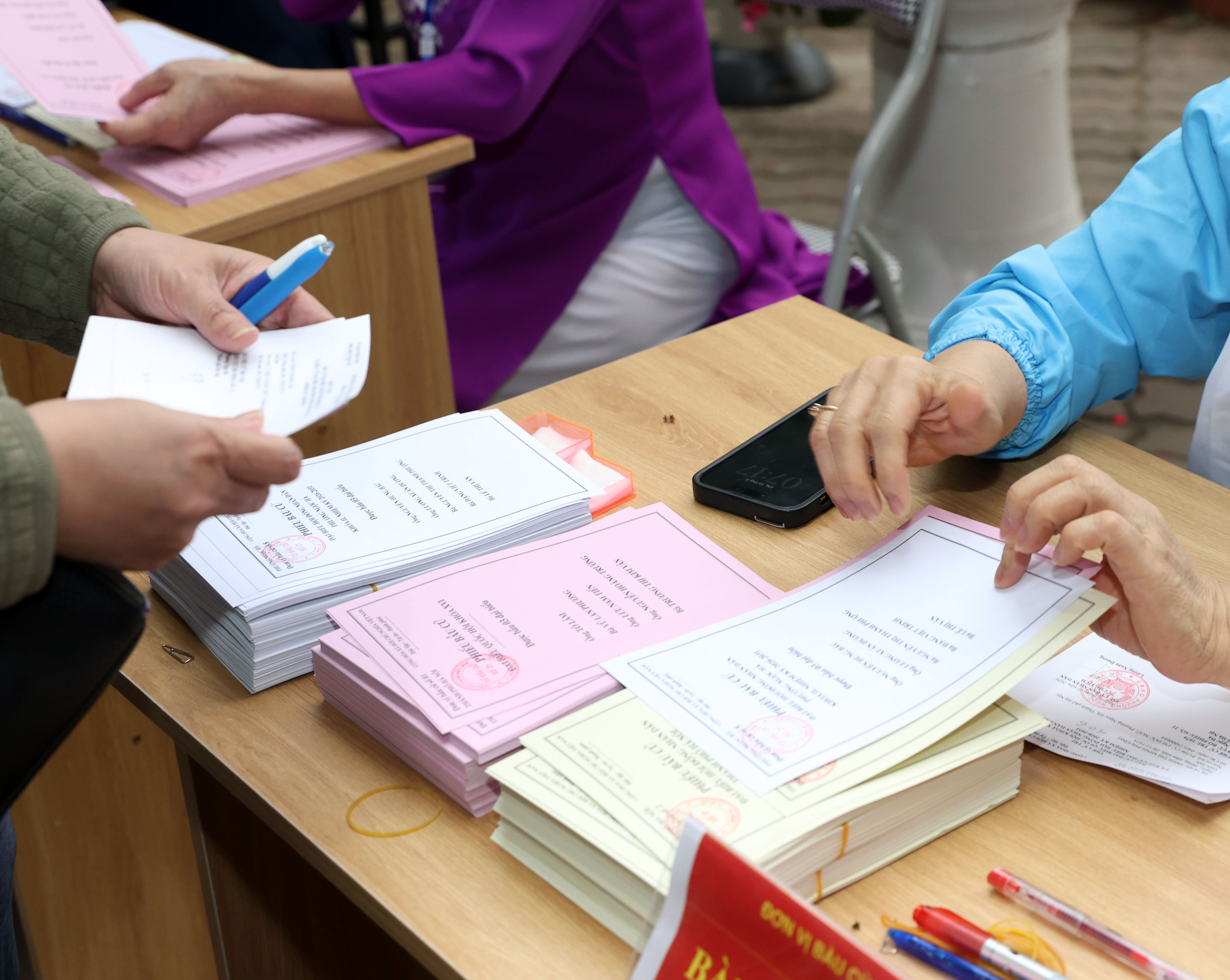 Những lá phiếu bầu cử được phát đến tận tay cử tri Khu vực bỏ phiếu số 21, phường Ngọc Hà, Hà Nội