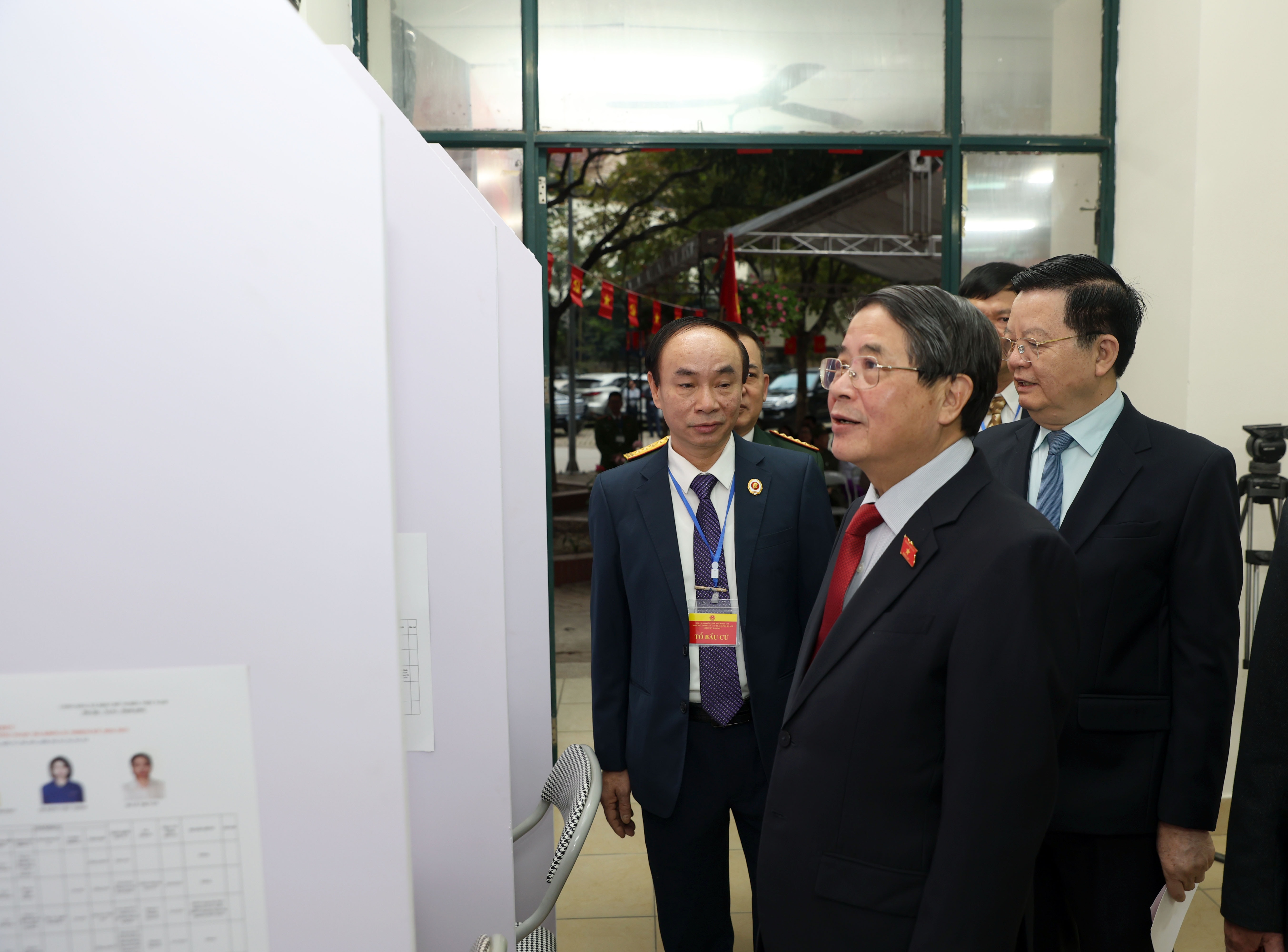 Phó Chủ tịch Quốc hội Nguyễn Đức Hải kiểm tra khu vực ghi phiếu bầu cử của cử tri tại Khu vực bỏ phiếu số 21, phường Ngọc Hà, Hà Nội