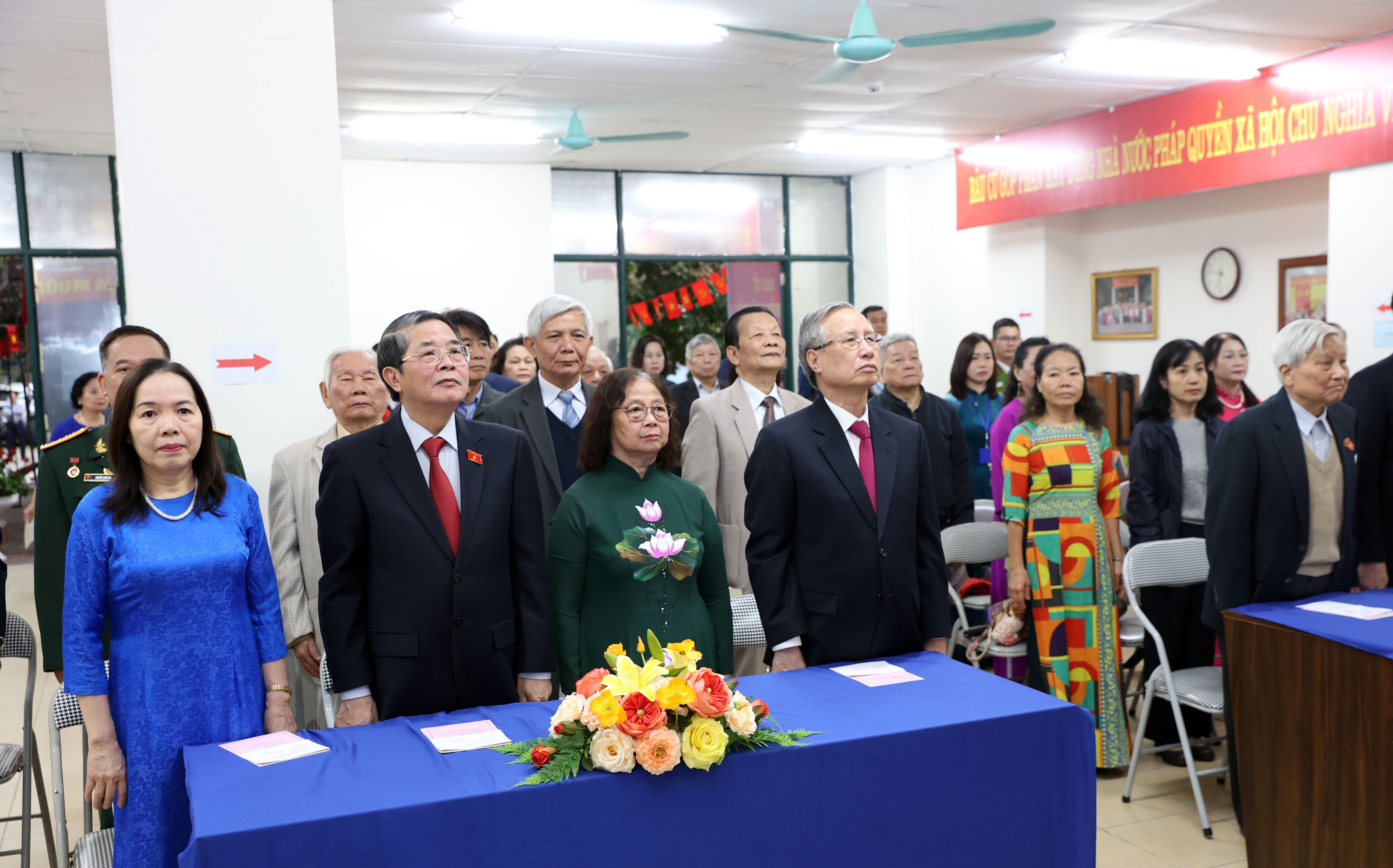 Nguyên Ủy viên Bộ Chính trị, nguyên Thường trực Ban Bí thư Trần Quốc Vượng; Phó Chủ tịch Quốc hội Nguyễn Đức Hải và các đại biểu thực hiện nghi lễ chào cờ tại Khu vực bỏ phiếu số 21, phường Ngọc Hà, Hà Nội