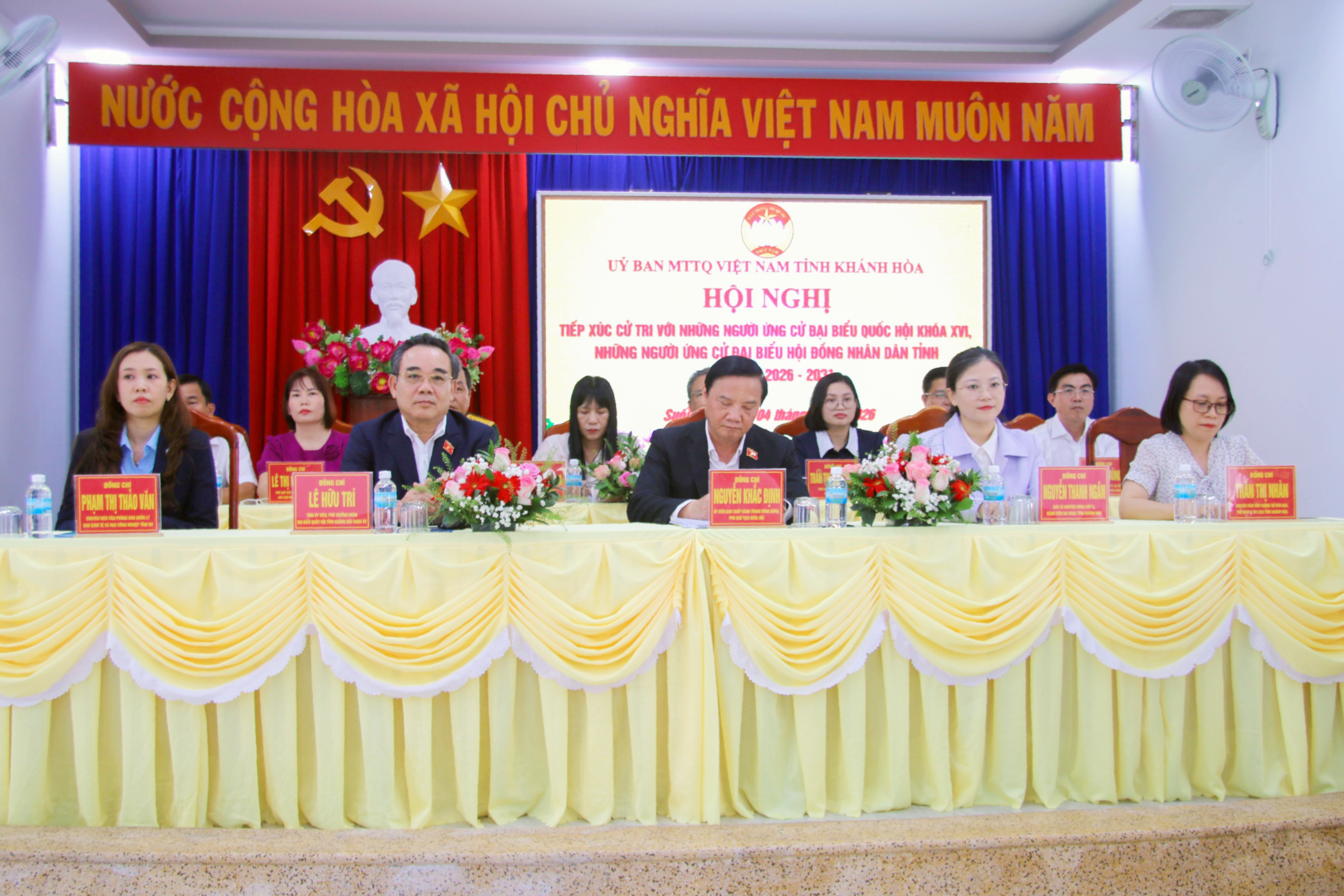 Tham dự Hội nghị, về phía ứng cử viên ĐBQH khóa XVI tại đơn vị bầu cử số 2 có: Ủy viên Trung ương Đảng, Ủy viên Ban Thường vụ Đảng ủy Quốc hội, Phó Chủ tịch Quốc hội, Ủy viên Hội đồng Bầu cử Quốc gia Nguyễn Khắc Định; Tỉnh ủy viên, Phó Trưởng đoàn chuyên trách phụ trách Đoàn ĐBQH tỉnh Khánh Hòa khóa XV Lê Hữu Trí; Bác sĩ chuyên khoa cấp II, Bệnh viện Đa khoa Khánh Hòa Nguyễn Thanh Ngân; chuyên viên Văn phòng Sở Văn hóa, Thể thao và Du lịch tỉnh Khánh Hòa Trần Thị Nhàn; chuyên viên Văn phòng Ban Quản lý Khu kinh tế và Khu Công nghiệp tỉnh Khánh Hòa Phạm Thị Thảo Văn.