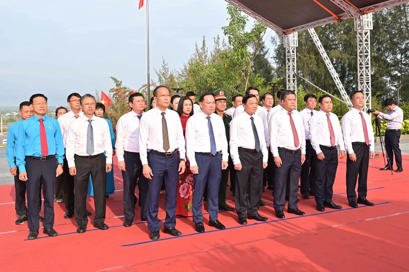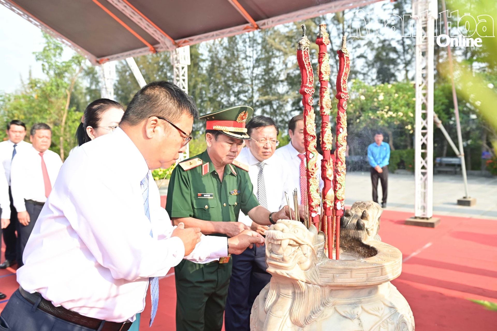 Phó Chủ tịch Quốc hội Nguyễn Khắc Định cùng lãnh đạo tỉnh Khánh Hòa và các đại biểu tham dự Lễ dâng hương tưởng niệm các chiến sĩ Gạc Ma tại Khánh Hòa. Ảnh: baokhanhhoa.vn