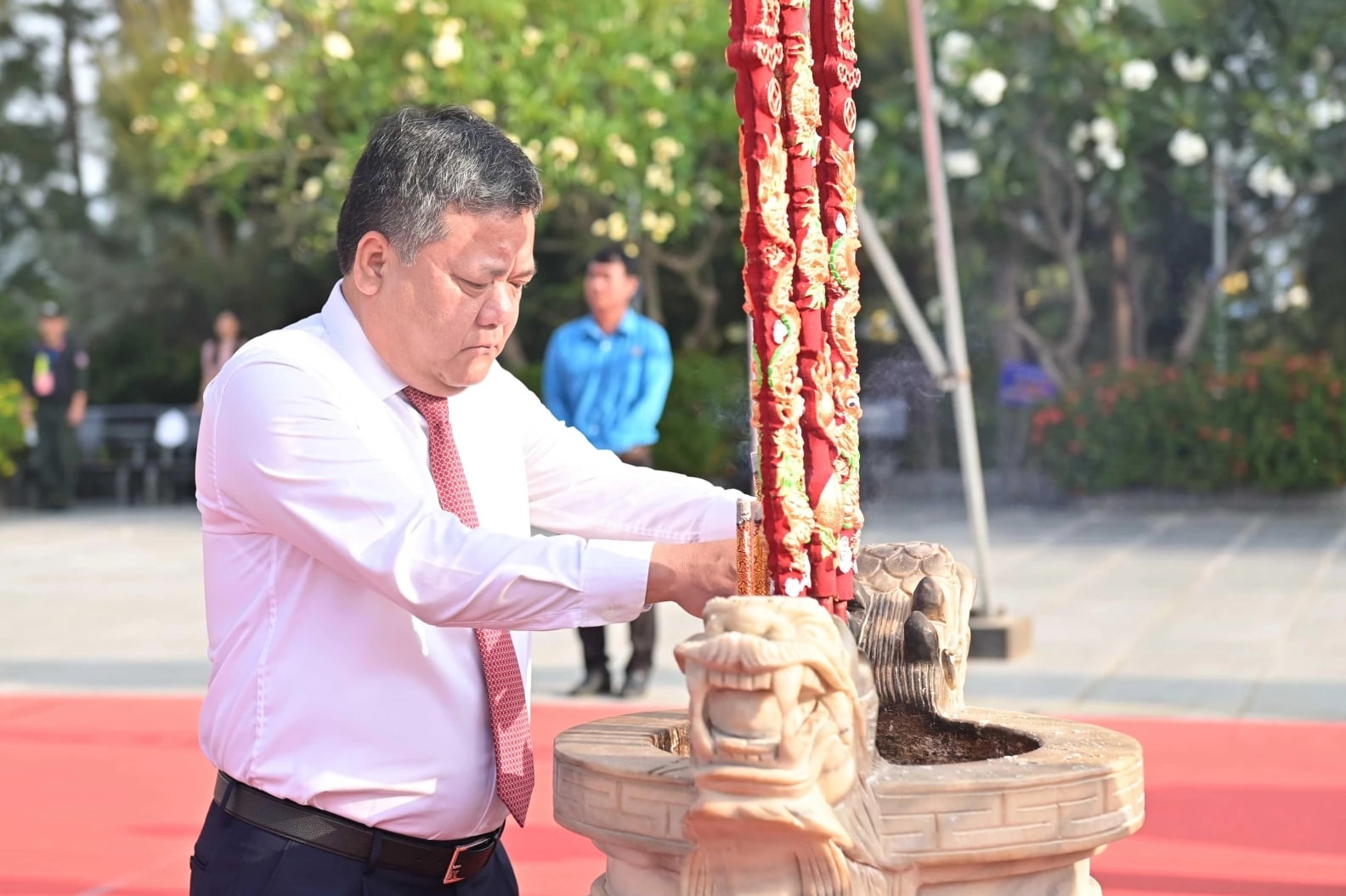 Phó Bí thư Thường trực Tỉnh ủy Khánh Hòa Hồ Xuân Trường dâng hương tưởng nhớ 64 chiến sĩ Hải quân nhân dân Việt Nam đã anh dũng hy sinh trong sự kiện Gạc Ma năm 1988. Ảnh: baokhanhhoa.vn