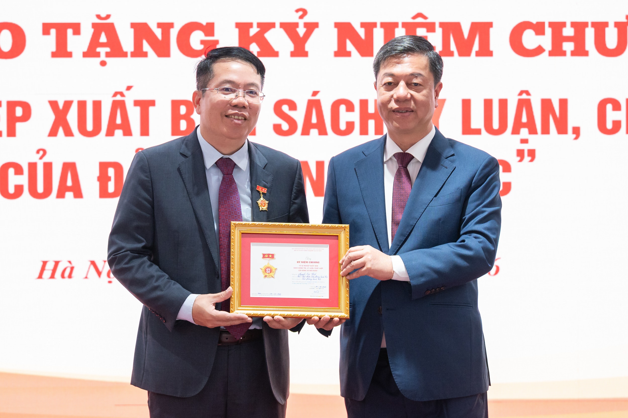 Giám đốc, Tổng Biên tập Nhà xuất bản Chính trị quốc gia Sự thật, PGS.TS. Vũ Trọng Lâm trao Kỷ niệm chương “Vì sự nghiệp xuất bản sách lý luận, chính trị của Đảng và Nhà nước” tặng Phó Chủ nhiệm Văn phòng Quốc hội Nguyễn Văn Hiển