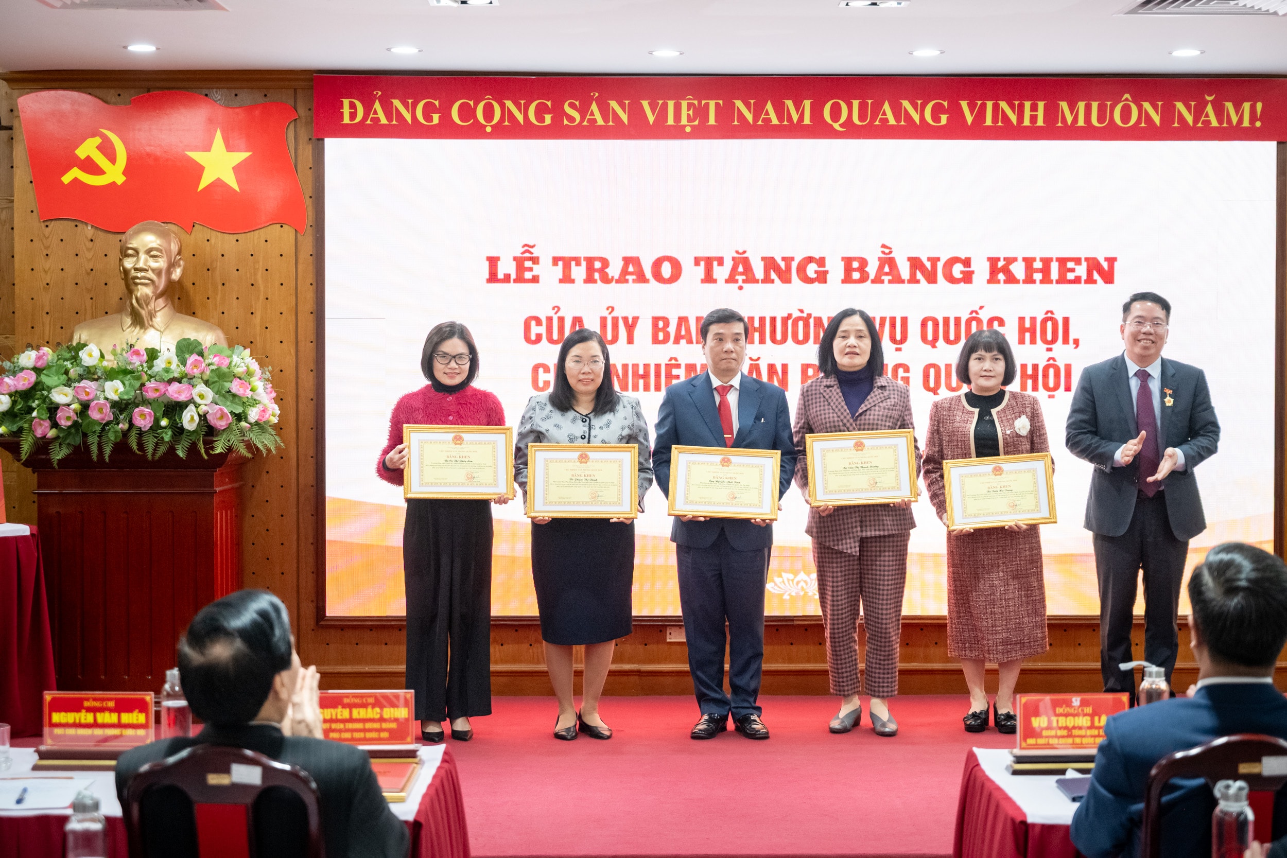Từ những kết quả rất đáng trân trọng đó, tại buổi lễ, Ủy ban Thường vụ Quốc hội và Văn phòng Quốc hội tổ chức trao tặng Bằng khen của Ủy ban Thường vụ Quốc hội, Bằng khen của Chủ nhiệm Văn phòng Quốc hội cho các tập thể, cá nhân có thành tích xuất sắc của Nhà xuất bản trong công tác phối hợp với Quốc hội thời gian qua.
