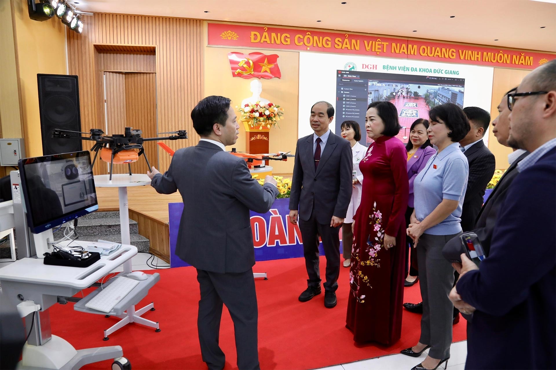 Phó Chủ tịch Quốc hội Nguyễn Thị Thanh nghe giới thiệu về thiết bị bay không người lái phục vụ vận chuyển máu, mẫu bệnh phẩm tại Bệnh viện đa khoa Đức Giang