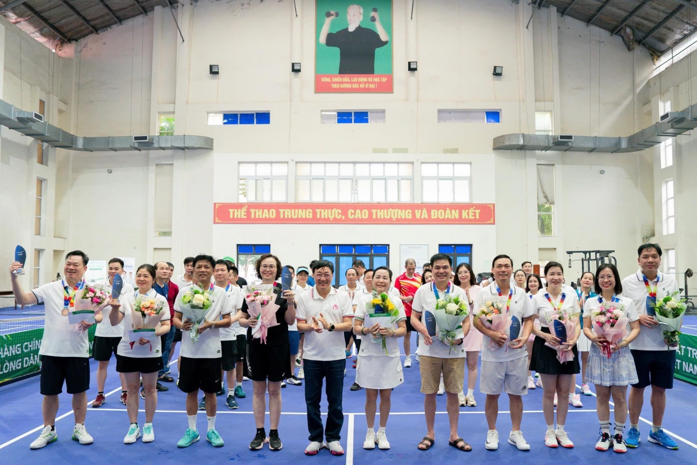 Phó Chủ tịch Quốc hội Nguyễn Thị Thanh và các vận động viên dự Giải Pickleball mở rộng chào mừng kỷ niệm 65 năm Hội đồng Dân tộc