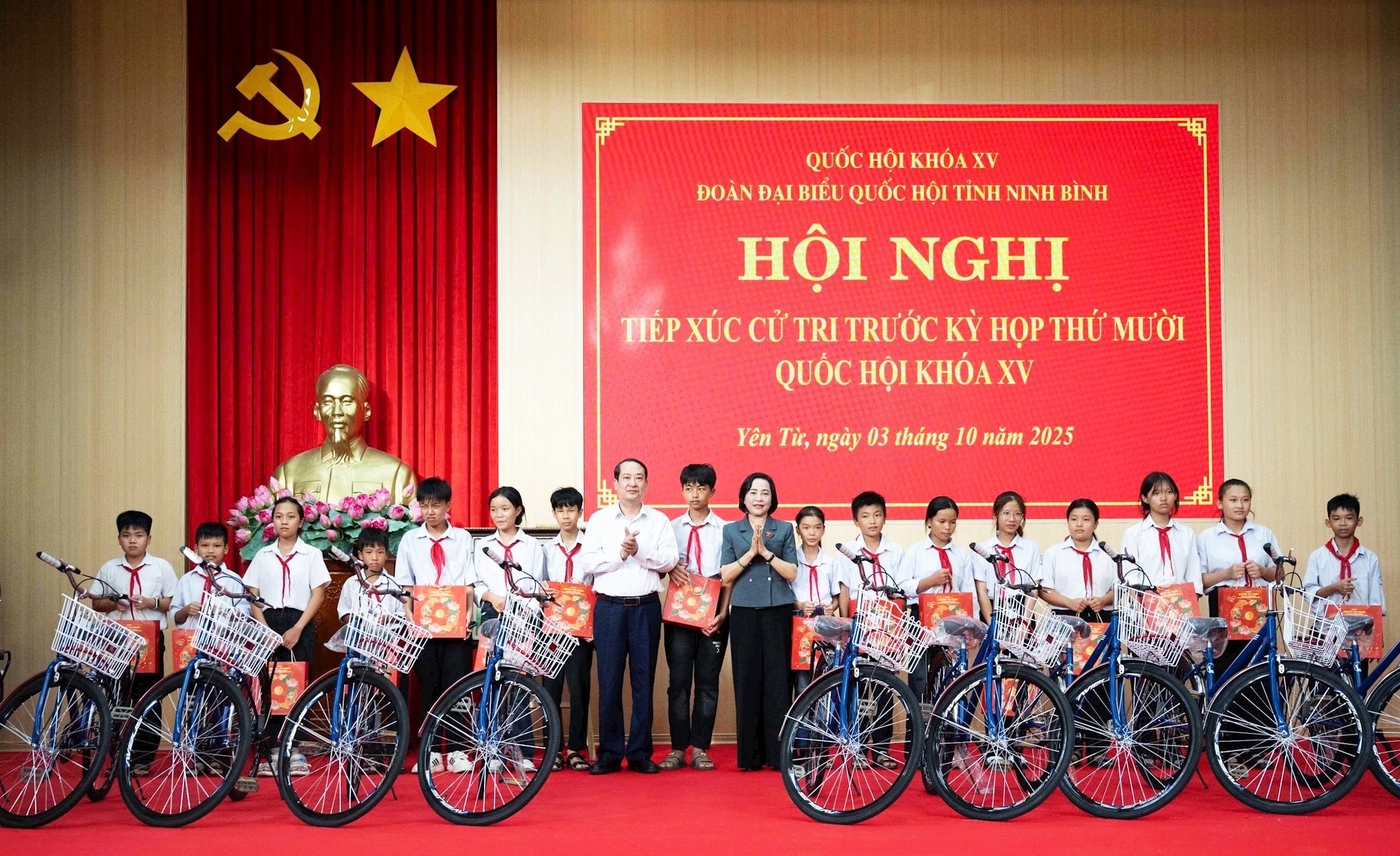 + Nhân dịp này, Phó Chủ tịch Quốc hội trao tặng 50 chiếc xe đạp của Quỹ Bảo trợ trẻ em Việt Nam cho các em học sinh có hoàn cảnh đặc biệt khó khăn trên địa bàn xã Yên Từ.