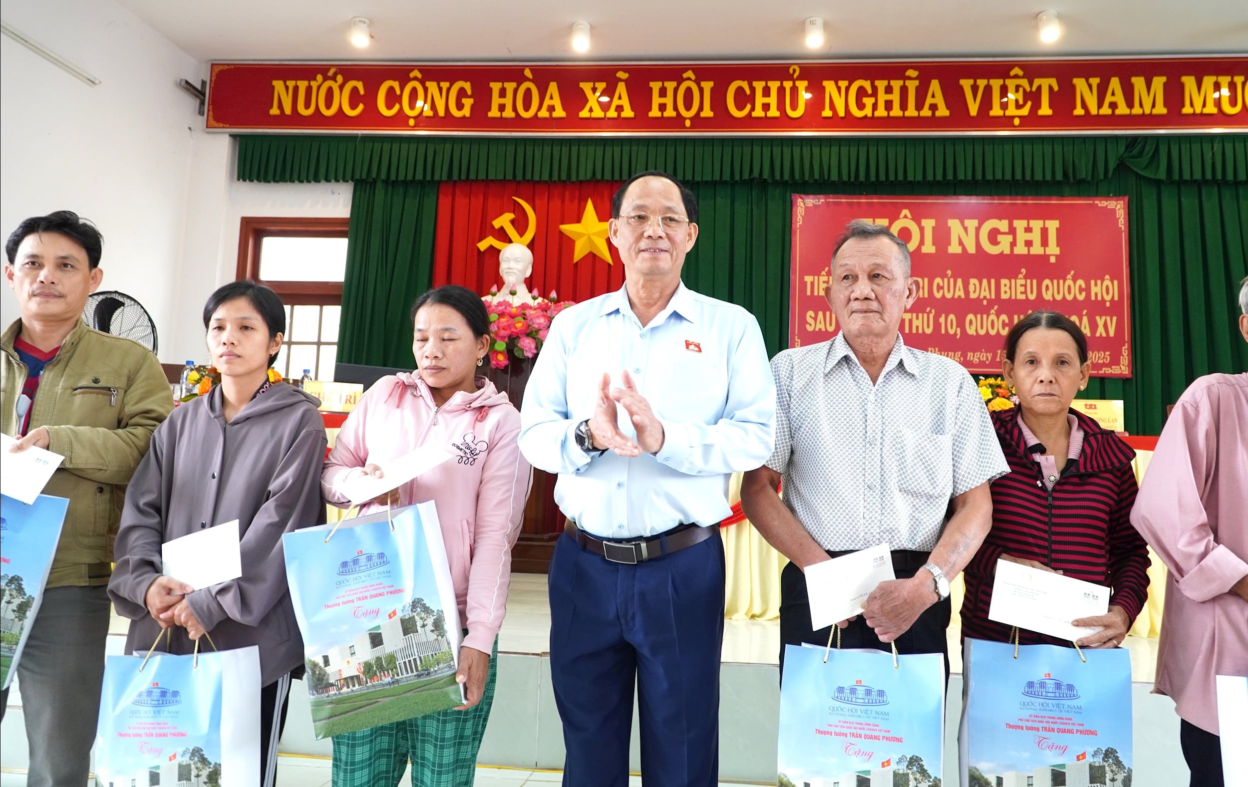 Nhân dịp này, Phó Chủ tịch Quốc hội, Thượng tướng Trần Quang Phương đã trao 30 phần quà tặng các gia đình chính sách, có nhiều khó khăn, chịu ảnh hưởng của đợt mưa lũ vừa qua; tặng quà cán bộ công chức, viên chức xã Long Phụng.