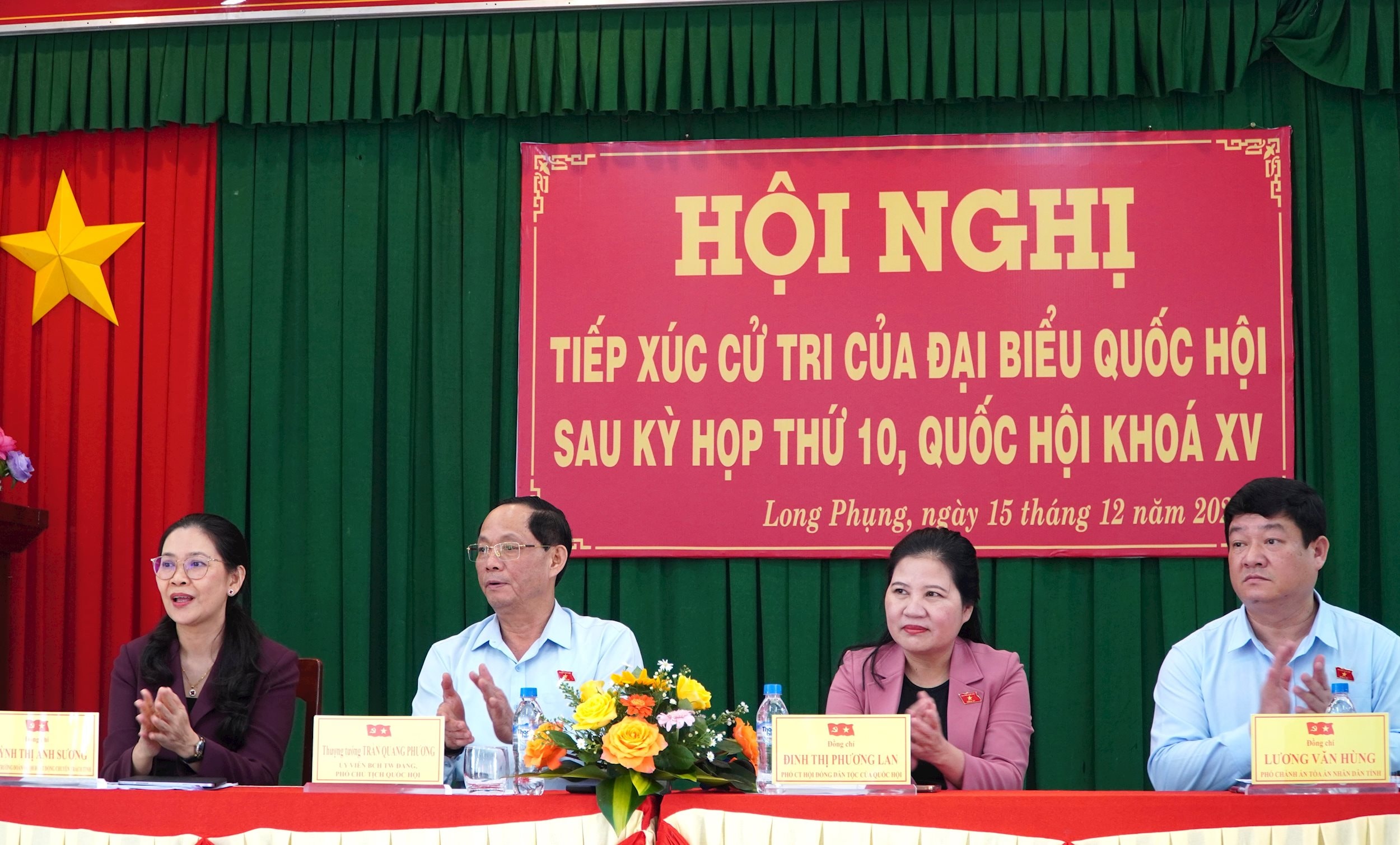 Phát biểu tại buổi tiếp xúc, Phó Chủ tịch Quốc hội Trần Quang Phương chia sẻ với những khó khăn của xã Long Phụng mới – địa phương được sáp nhập từ bốn xã, tồn tại nhiều vấn đề kéo dài; đề nghị chính quyền địa phương khẩn trương rà soát, phân loại vấn đề, việc gì dễ thì làm trước, việc khó thì kiên trì giải quyết, những vấn đề mới phải làm nhanh, đúng quy chuẩn, tiêu chuẩn và theo các nghị quyết của Quốc hội, hướng dẫn của Chính phủ.