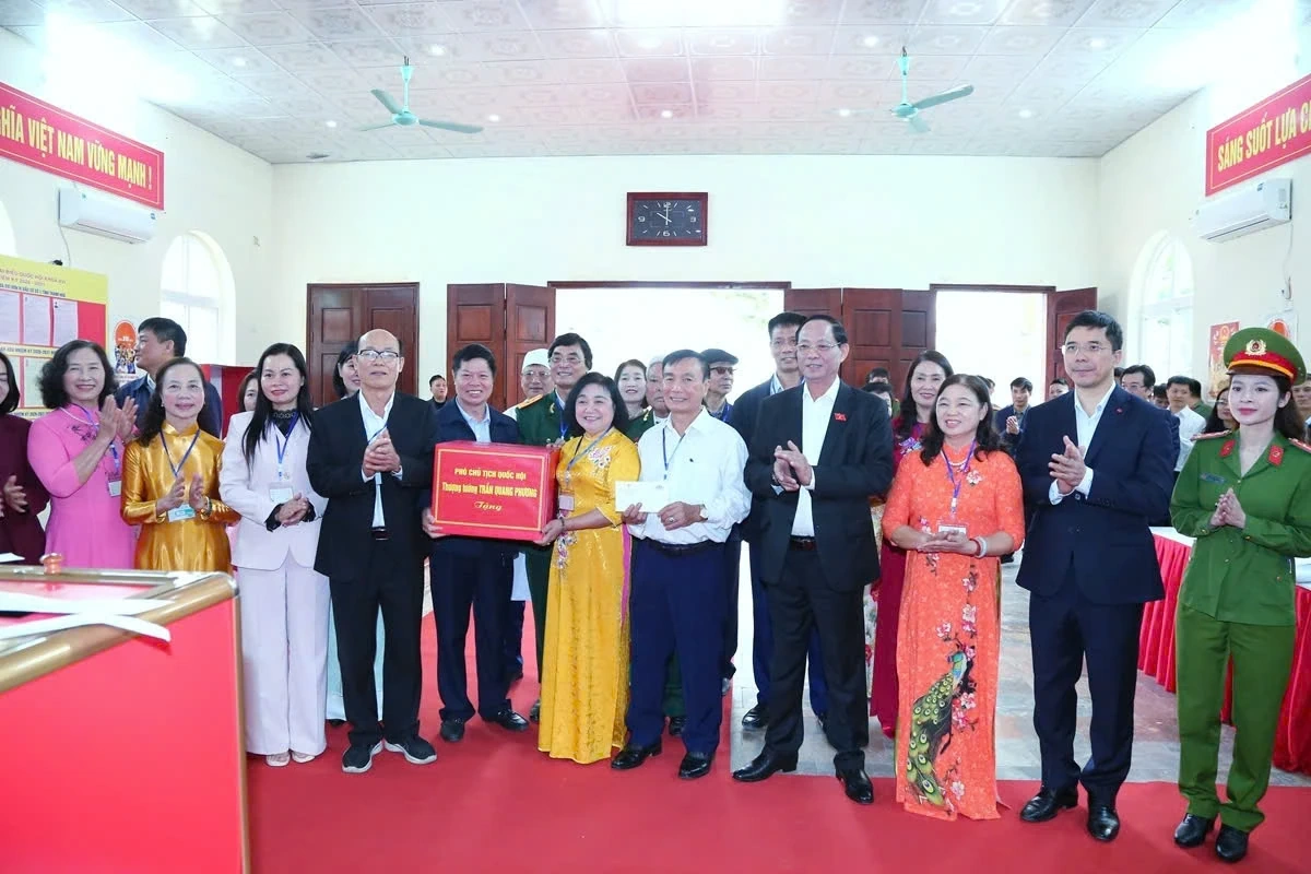 Phó Chủ tịch Quốc hội Trần Quang Phương tặng quà cho Tổ bầu cử tại Khu vực bỏ phiếu số 58, đặt tại nhà văn hóa phố Bình Minh, phường Hạc Thành.