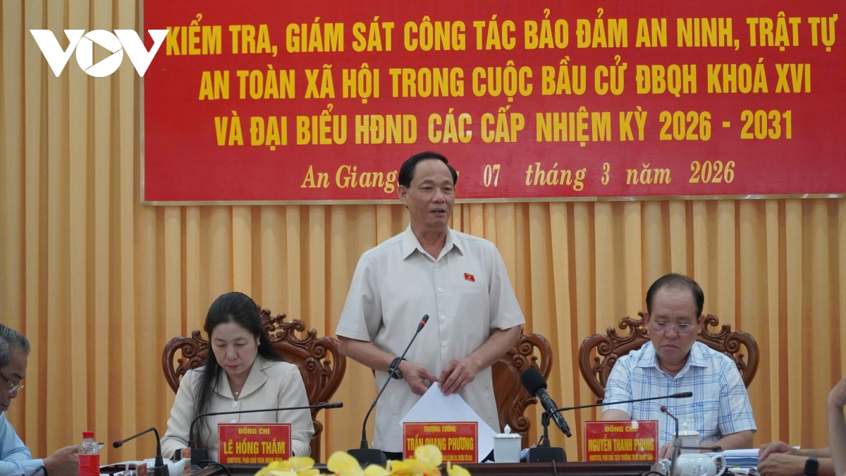 Báo cáo với đoàn công tác, Ủy ban Bầu cử tỉnh An Giang cho biết: đến thời điểm hiện tại, An Giang đã hoàn tất công tác rà soát với hơn 3,6 triệu cử tri trên toàn tỉnh, xác định 2.712 khu vực bỏ phiếu. Quy trình hiệp thương, giới thiệu nhân sự ứng cử đại biểu Quốc hội khóa XVI và đại biểu HĐND các cấp nhiệm kỳ 2026 - 2031 được thực hiện đúng quy định; chưa phát sinh dư luận trái chiều. 100% cán bộ, chiến sĩ lực lượng vũ trang tỉnh đã được quán triệt nhiệm vụ, duy trì trạng thái sẵn sàng chiến đấu, thường xuyên luyện tập các phương án xử lý tình huống phát sinh.