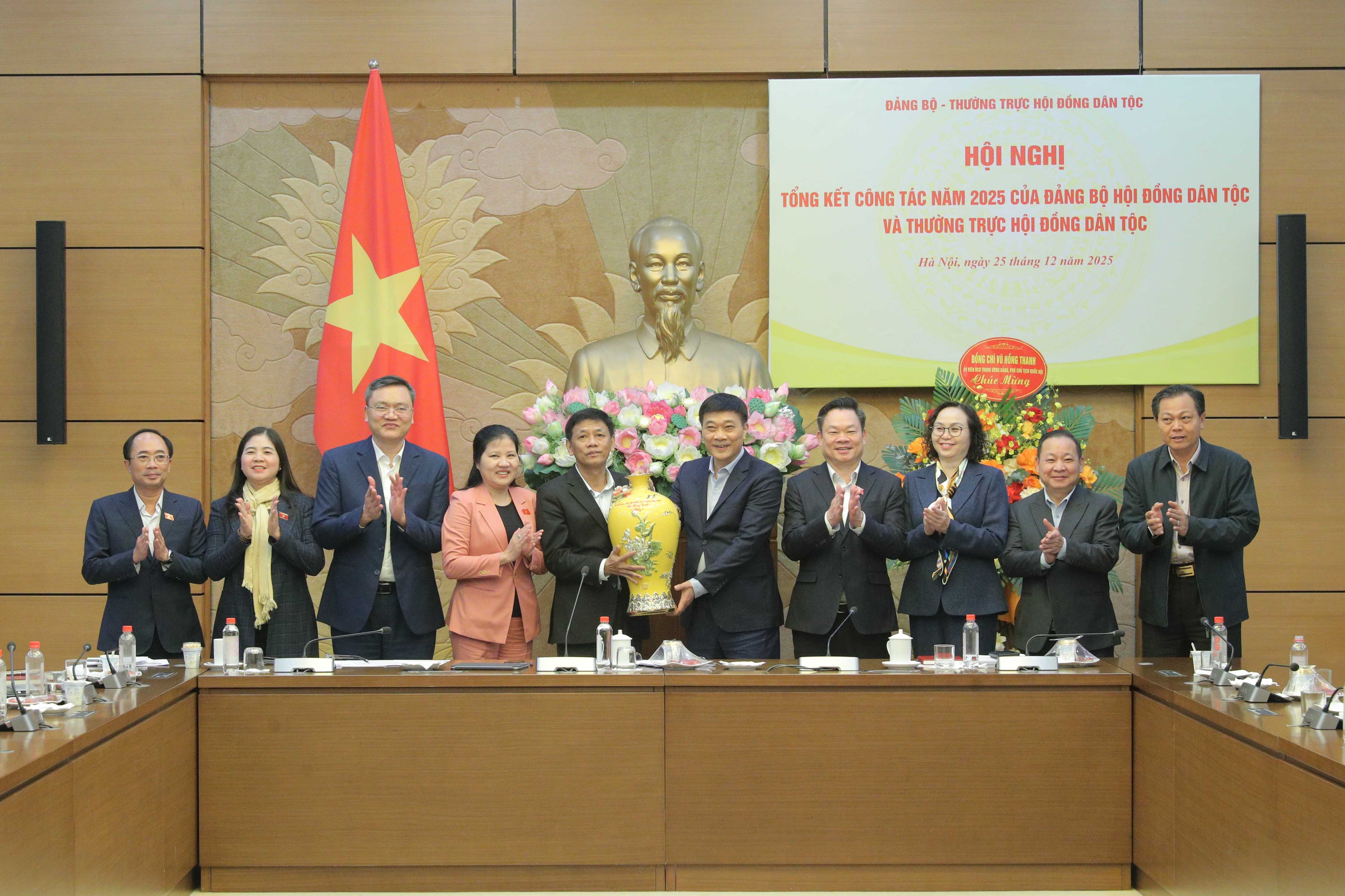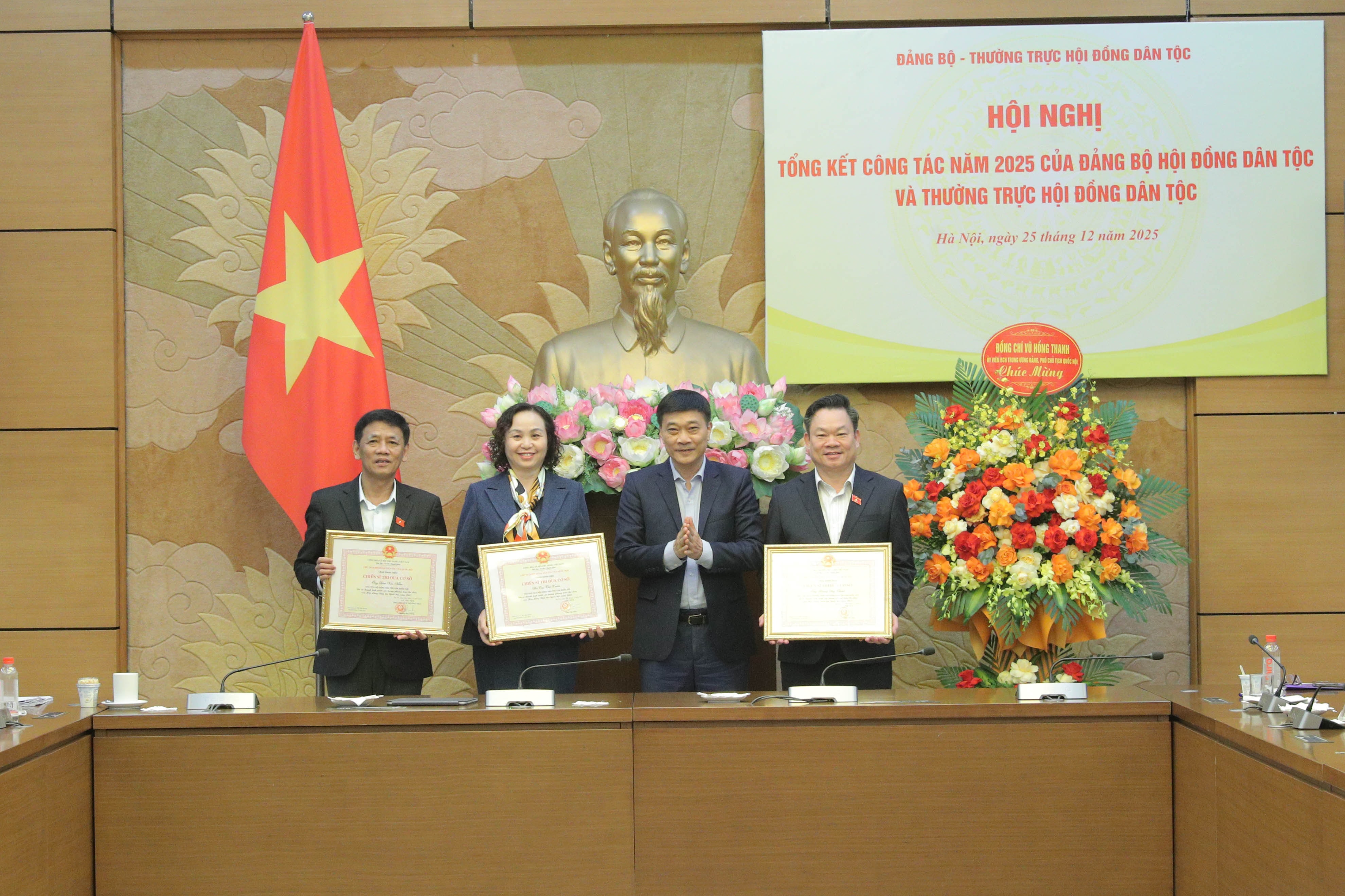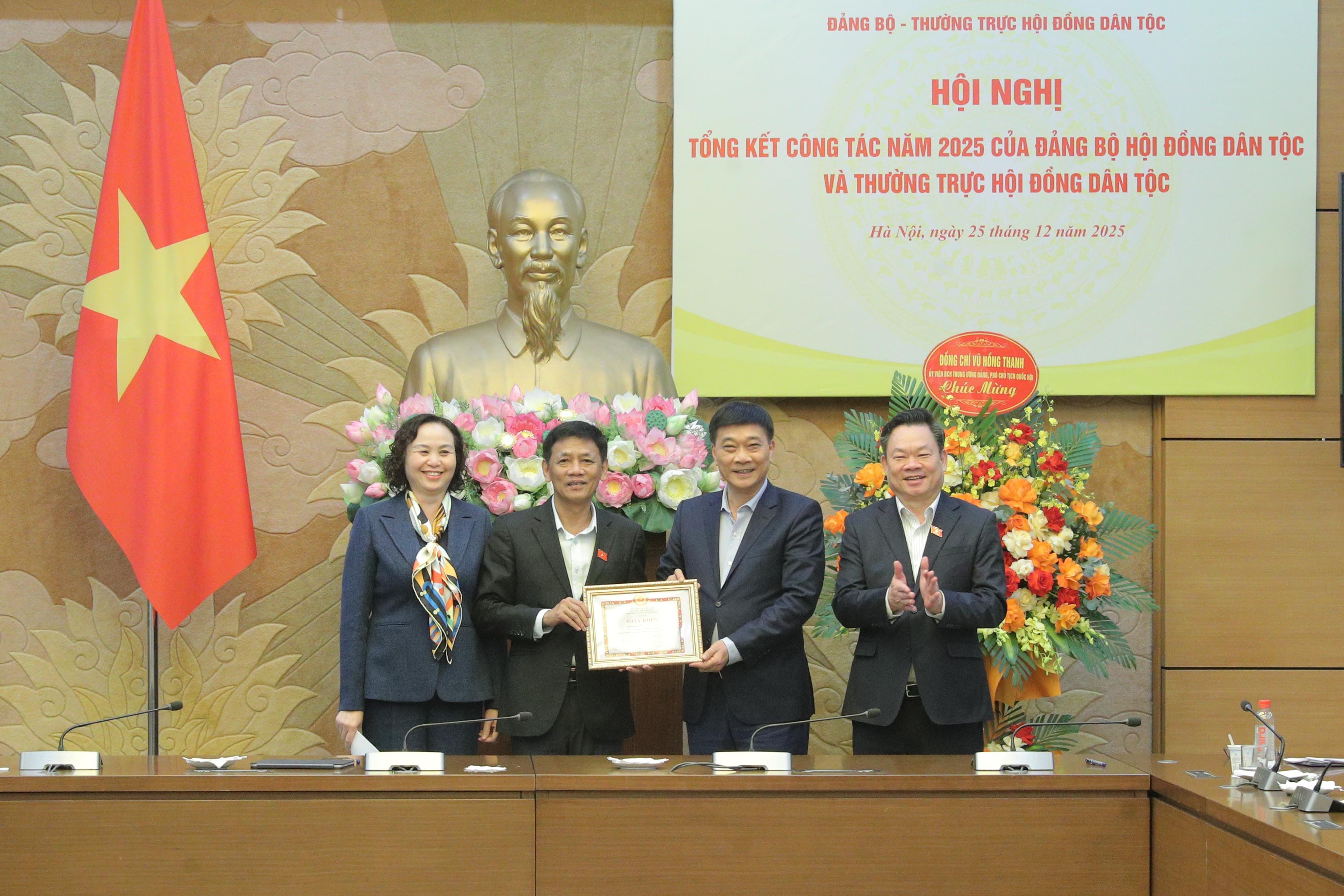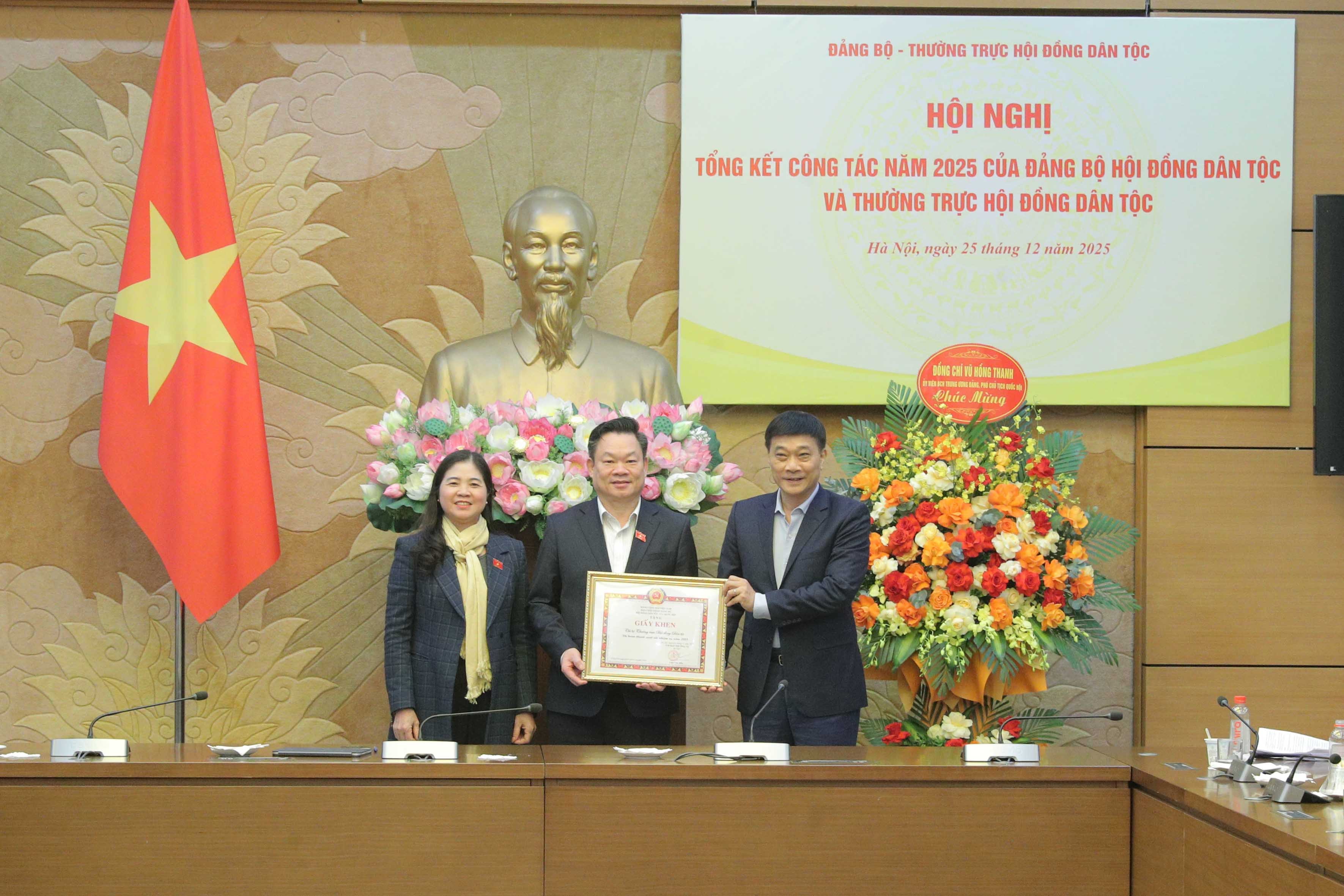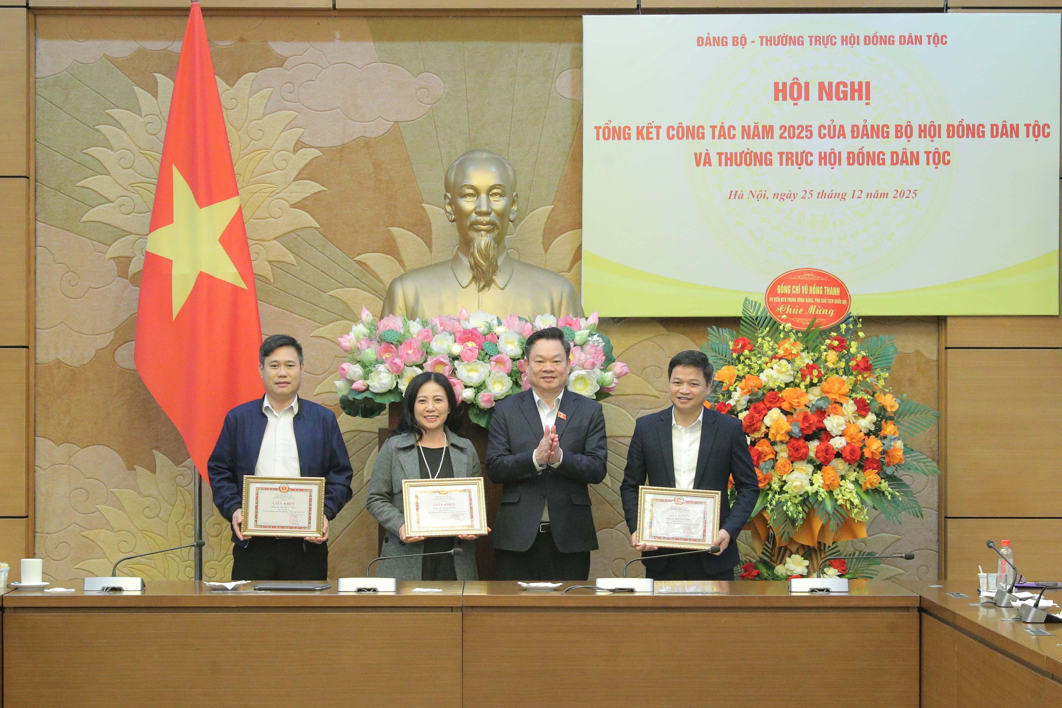 Bí thư Đảng ủy, Chủ tịch Hội đồng Dân tộc Lâm Văn Mẫn trao Giấy khen đảng viên xuất sắc năm 2025 của Đảng bộ Hội đồng Dân tộc tặng Phó Chủ tịch Quốc hội Vũ Hồng Thanh - đảng viên sinh hoạt tại Chi bộ Thường trực Hội đồng Dân tộc; trao danh hiệu Chiến sĩ thi đua cơ sở năm 2025 tặng 7 công chức của Vụ Dân tộc.