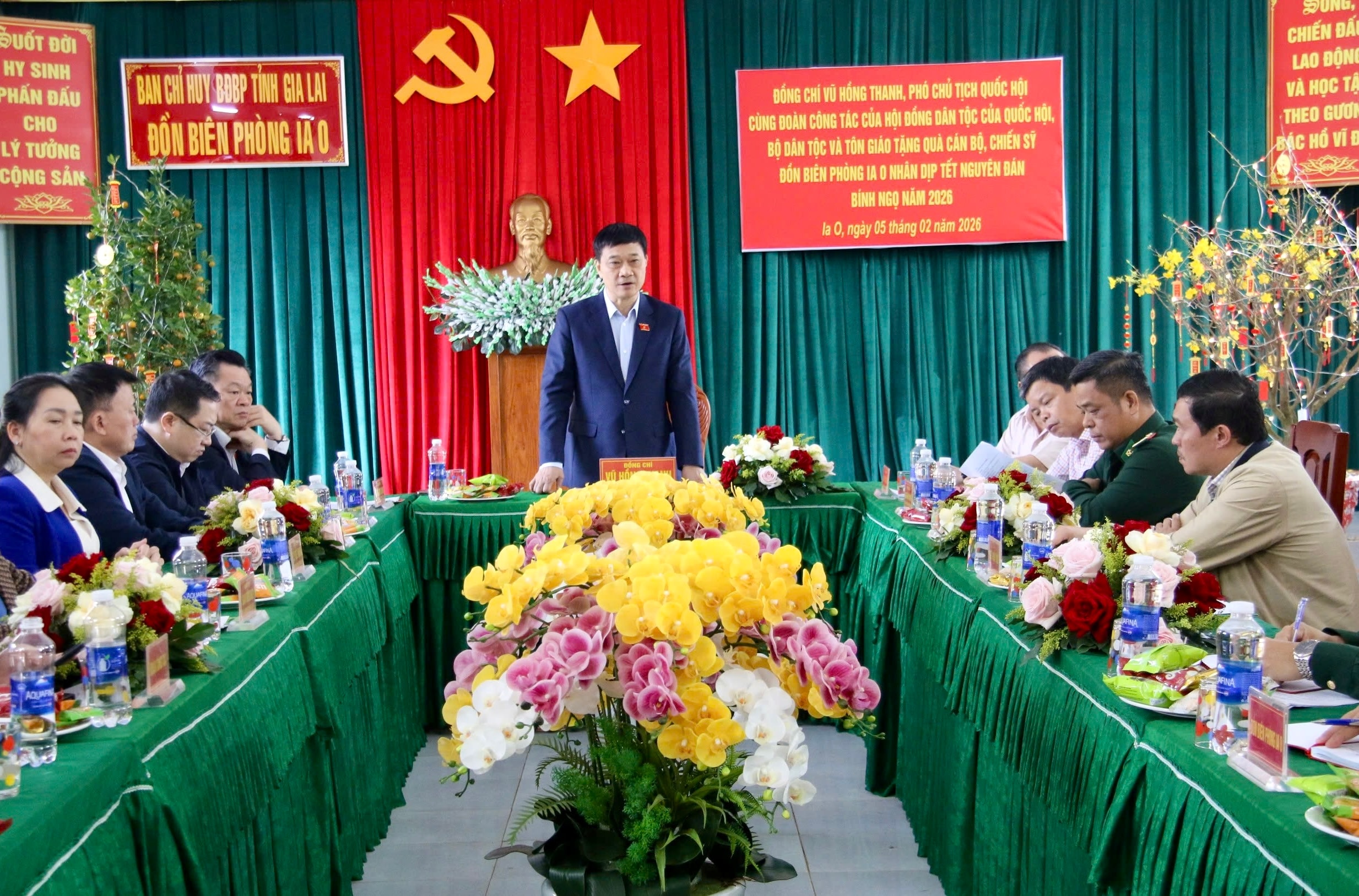 Tại Đồn Biên phòng Ia O, Phó Chủ tịch Quốc hội Vũ Hồng Thanh và Đoàn công tác thăm hỏi tình hình công tác, đời sống, nhiệm vụ trực sẵn sàng chiến đấu của cán bộ, chiến sĩ đơn vị trong dịp Tết Nguyên đán Bính Ngọ 2026.