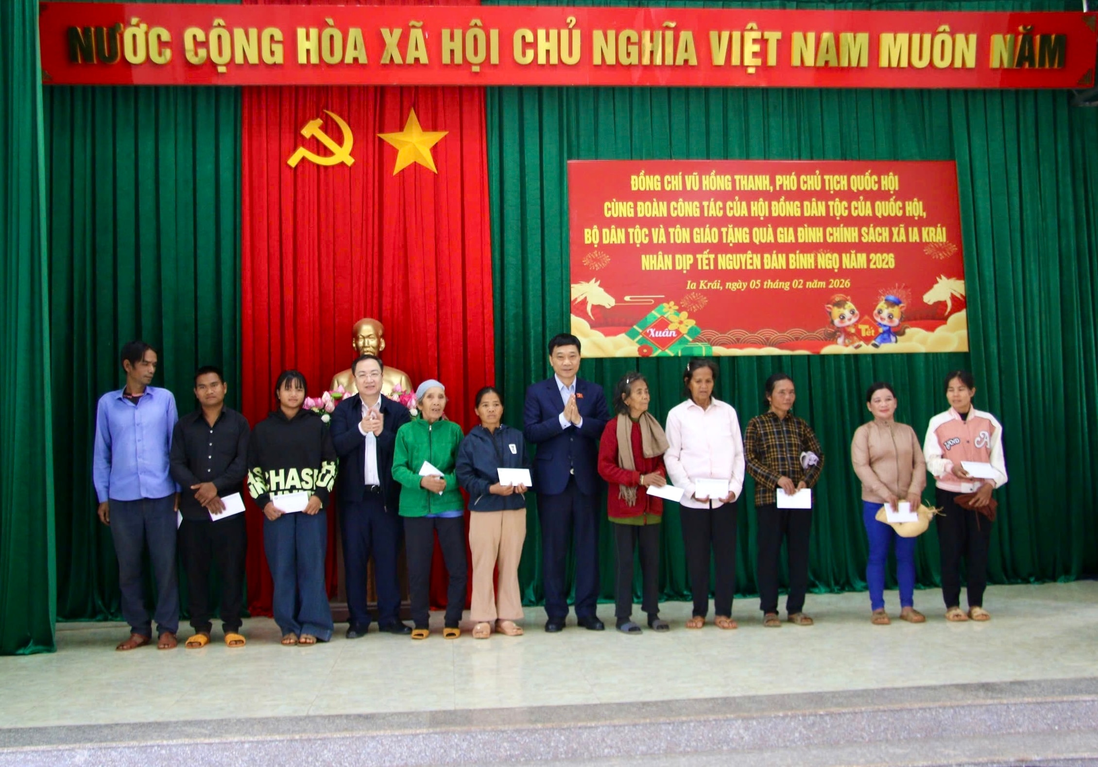 Tại xã Ia Krái, Phó Chủ tịch Quốc hội Vũ Hồng Thanh và Đoàn đã trao quà tặng Đảng bộ, chính quyền địa phương; trao 200 phần quà của Hội đồng Dân tộc tặng các hộ nghèo đồng bào dân tộc thiểu số. Lãnh đạo tỉnh Gia Lai cũng trao 5 phần quà tặng 5 gia đình chính sách tiêu biểu của xã Ia Krái. Những phần quà Tết thiết thực thể hiện sự quan tâm, sẻ chia, góp phần động viên các gia đình chính sách, hộ nghèo, đồng bào dân tộc thiểu số đón Tết cổ truyền ấm áp, đủ đầy hơn.