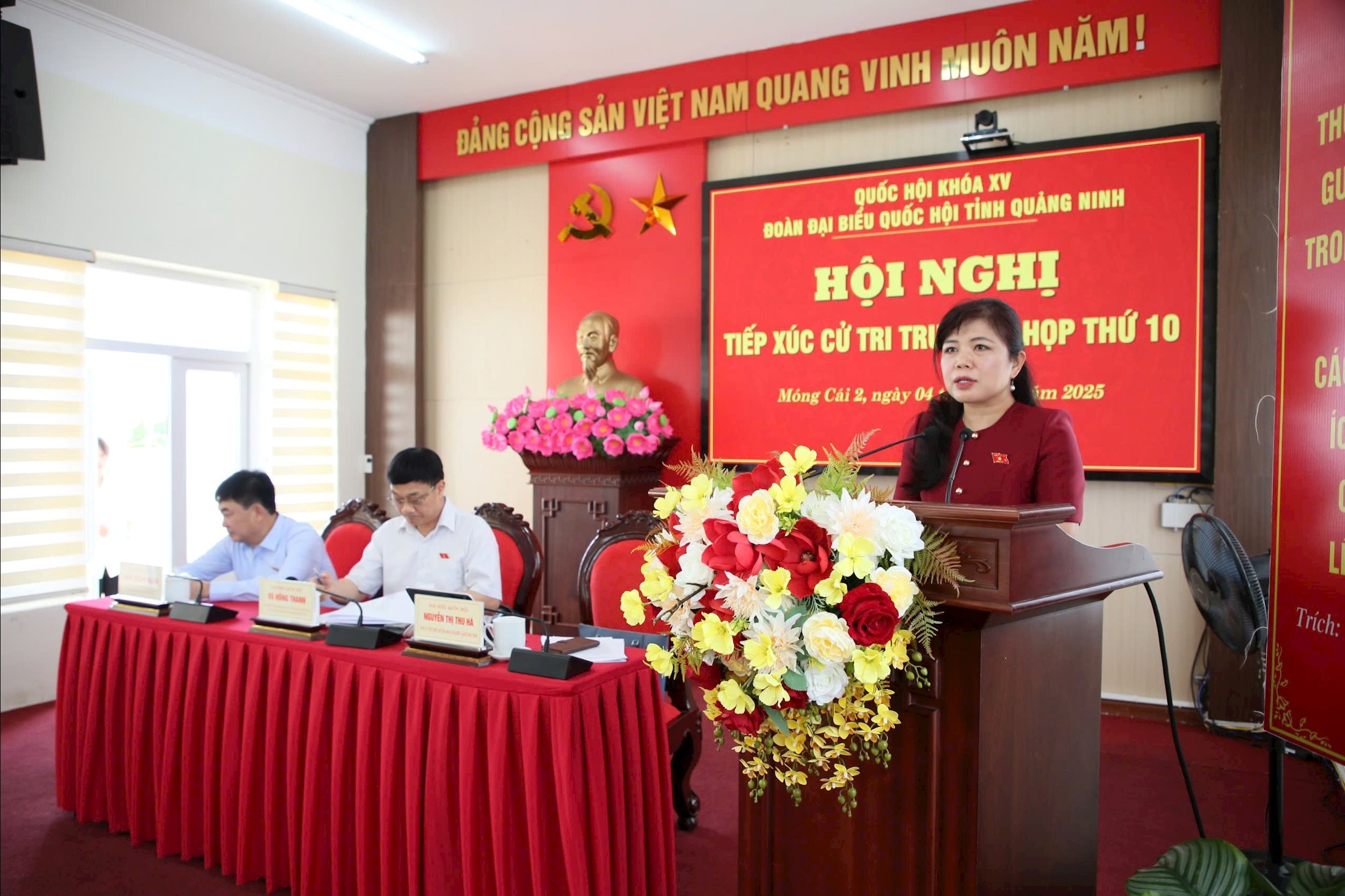 Tại cuộc tiếp xúc cử tri, Phó Trưởng đoàn chuyên trách Đoàn ĐBQH tỉnh Quảng Ninh Nguyễn Thị Thu Hà thông tin về kết quả giải quyết và trả lời các kiến nghị của các bộ, ngành Trung ương đối với kiến nghị của cử tri Quảng Ninh gửi đến Kỳ họp thứ Chín.