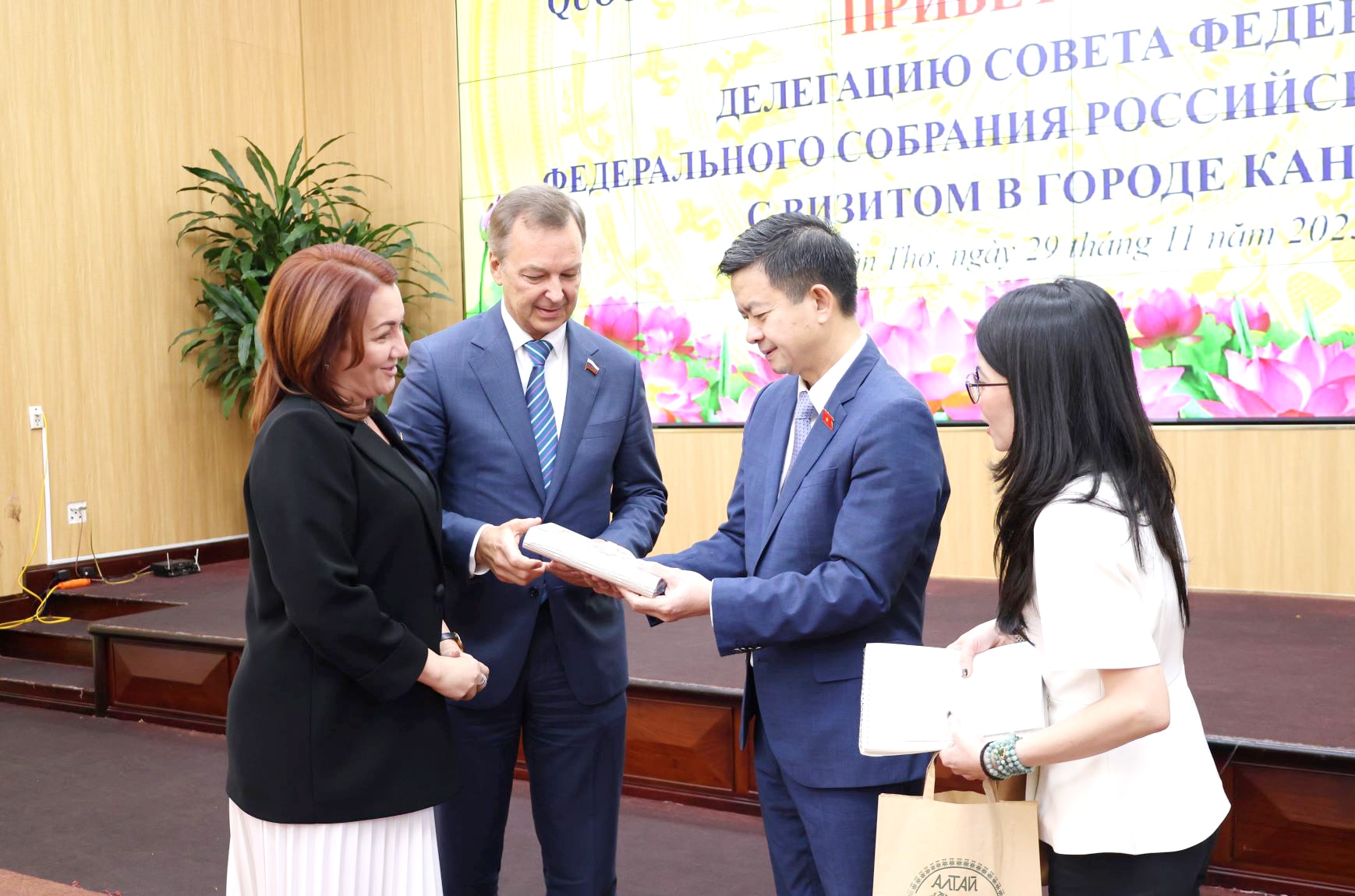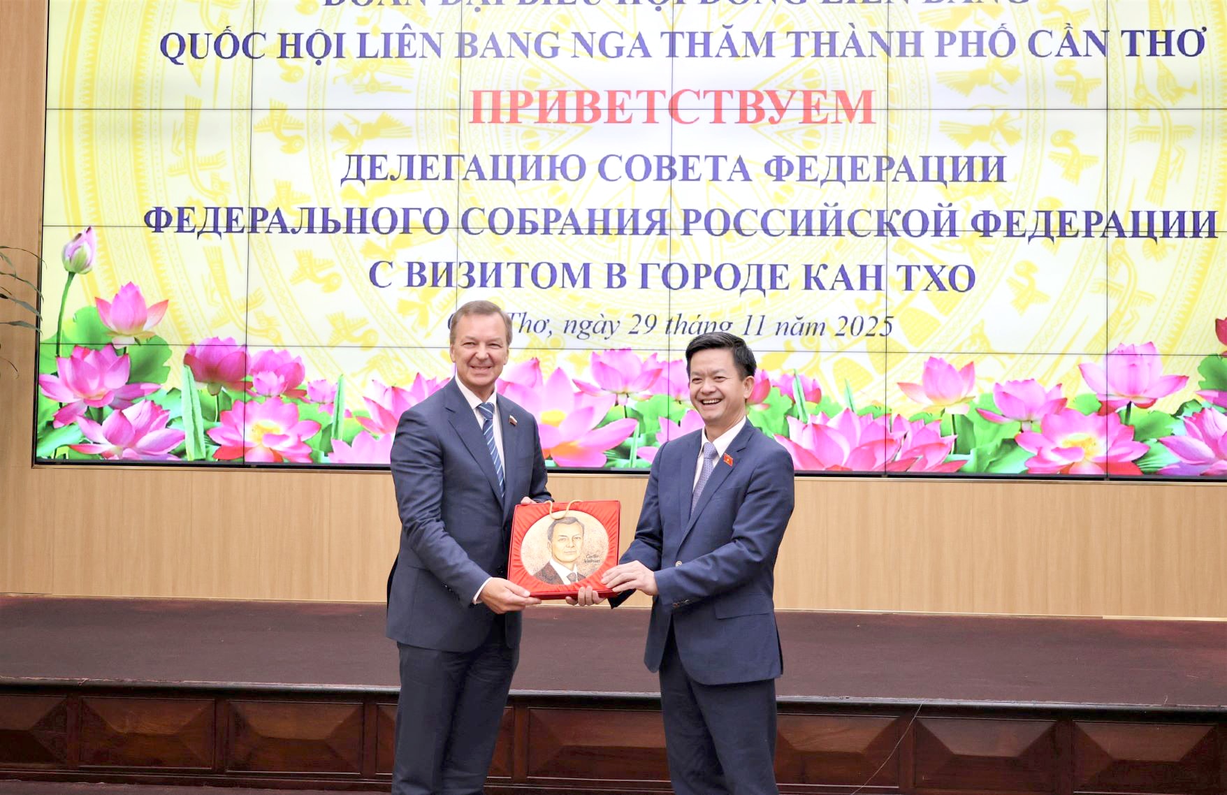 Bí thư Thành ủy Cần Thơ Lê Quang Tùng trao quà lưu niệm tặng Phó Chủ tịch thứ nhất Hội đồng liên bang Quốc hội Liên bang Nga A.V. Yatskin