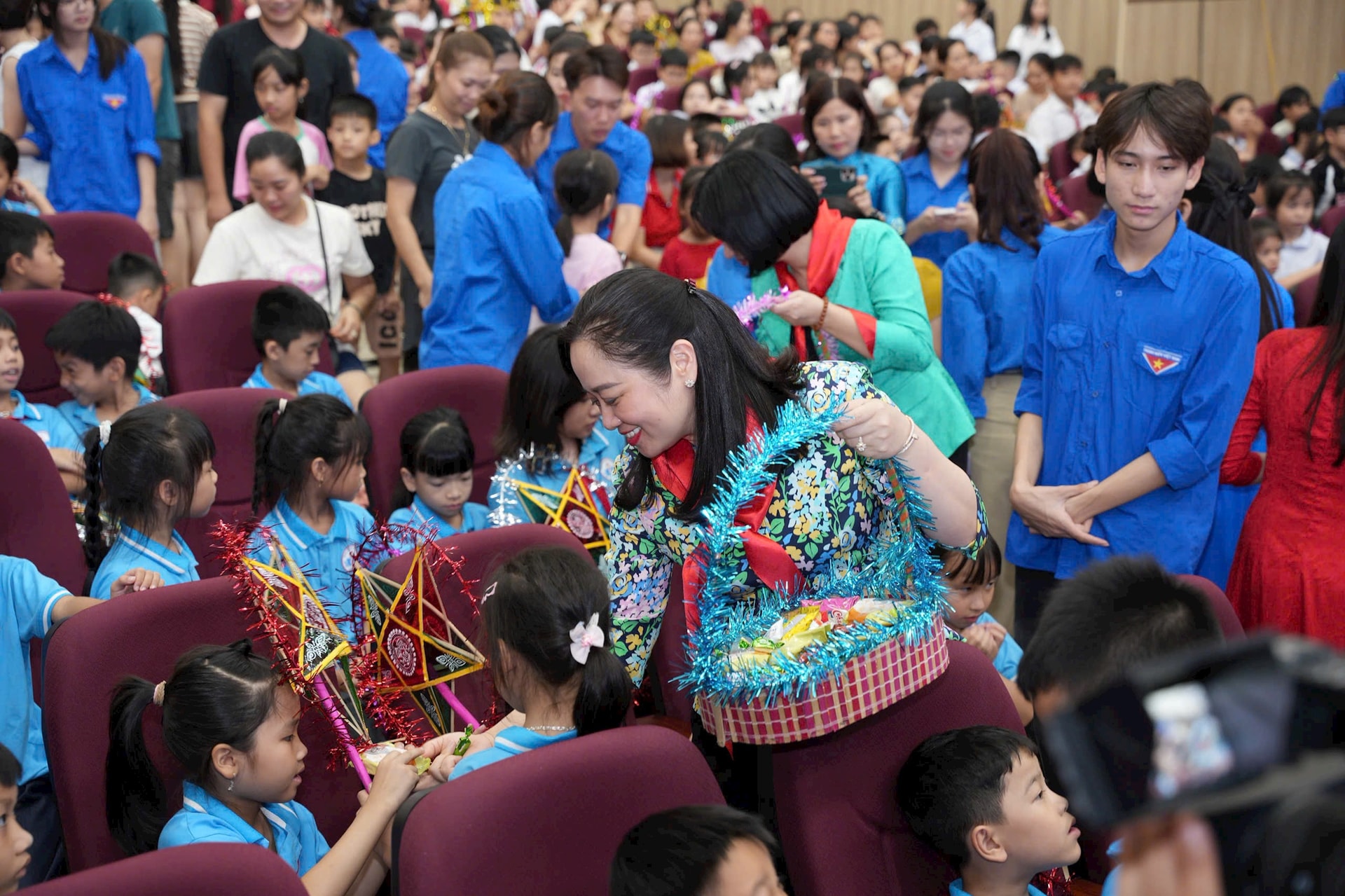 Lãnh đạo thành phố và xã Vân Đình tặng quà các cháu thiếu nhi tại đêm hội trăng rằm năm 2025 của xã. Ảnh: ĐÌnh Thủy