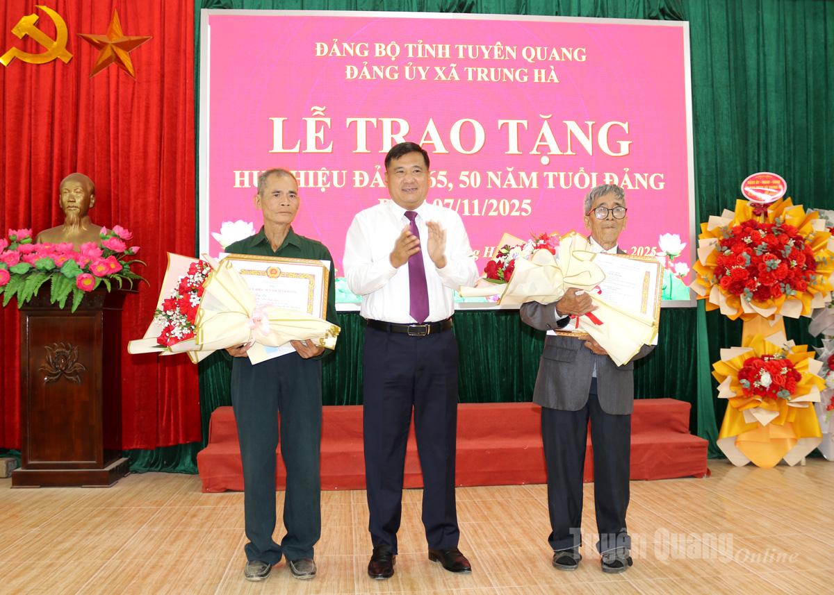 Tại buổi lễ, thay mặt Ban Thường vụ Tỉnh ủy, đồng chí Hầu Minh Lợi đã trao Huy hiệu 60 năm tuổi Đảng cho đảng viên La Văn Phác, Chi bộ thôn Nà Dầu; 50 năm tuổi Đảng cho đảng viên Ma Đức Lộc, Chi bộ thôn Nà Đao.