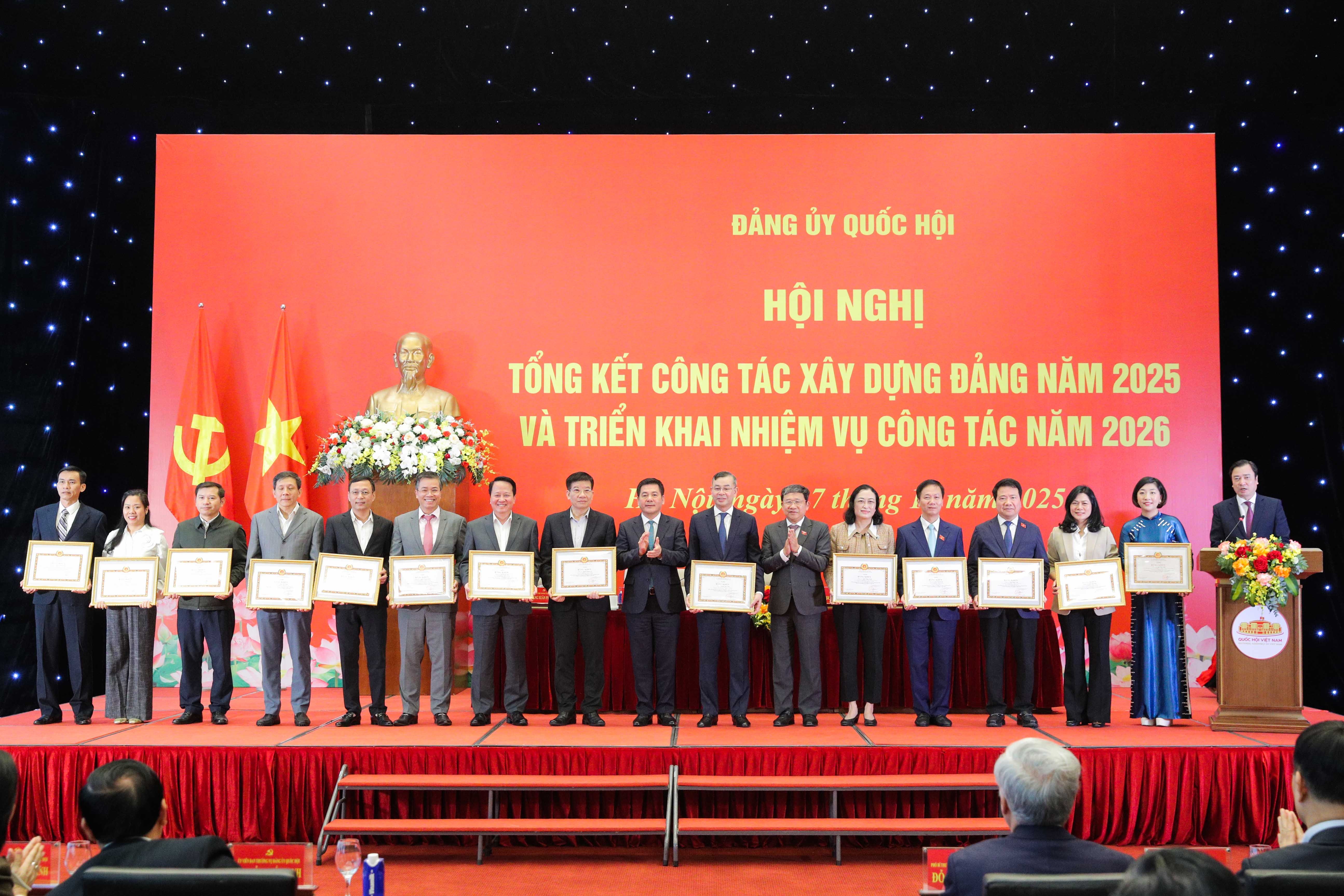 Phó Bí thư chuyên trách Đảng ủy Quốc hội Nguyễn Hồng Diên, Phó Bí thư Đảng ủy Quốc hội Vũ Hải Hà trao Bằng khen của Ban Thường vụ Đảng ủy Quốc hội tặng 15 cá nhân có thành tích xuất sắc trong công tác tham mưu, phục vụ Đại hội Đảng bộ Quốc hội nhiệm kỳ 2025 - 2030.