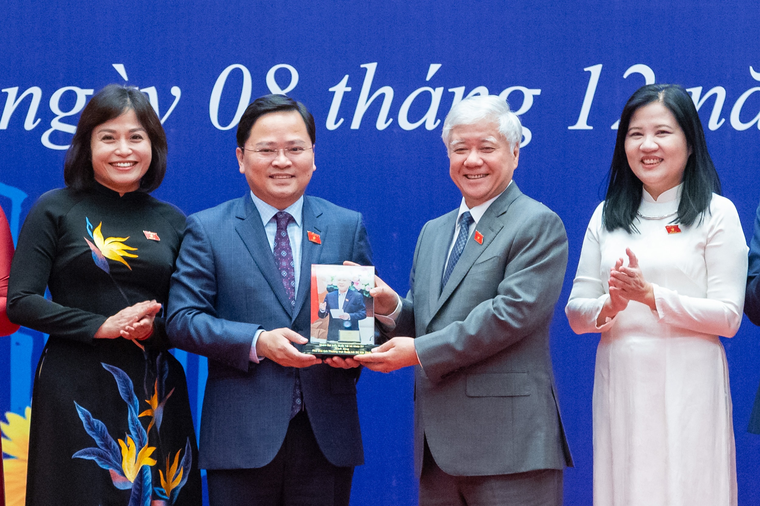 Phó Chủ tịch Thường trực Quốc hội Đỗ Văn Chiến trao quà lưu niệm tặng Ban Thường trực Nhóm ĐBQH trẻ Khóa XV