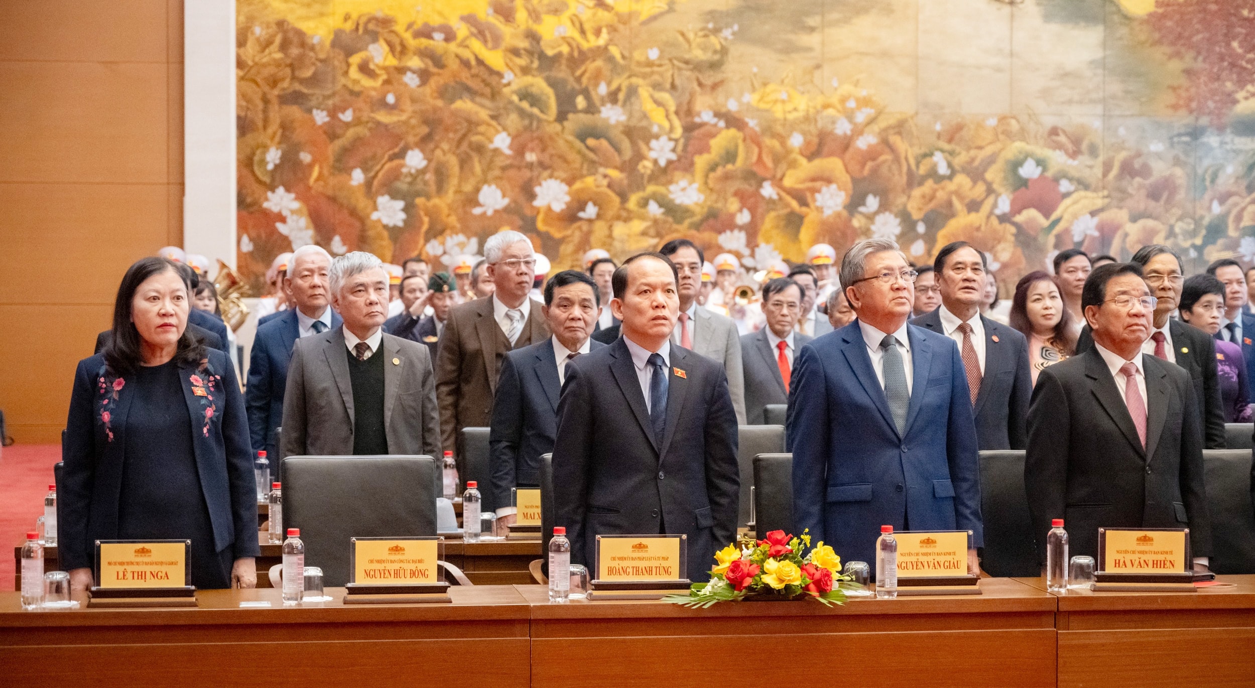 Nguyên Chủ tịch Quốc hội Nguyễn Thị Kim Ngân; Phó Chủ tịch Thường trực Quốc hội Đỗ Văn Chiến và các đại biểu dự Lễ kỷ niệm 80 năm thành lập Ủy ban Kinh tế và Tài chính thực hiện nghi thức chào cờ