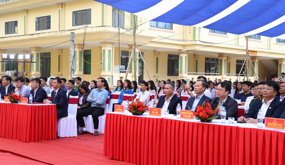 Các đại biểu dự lễ phát động Tết Trồng cây tại Trường Trung học cơ sở Nguyệt Đức.