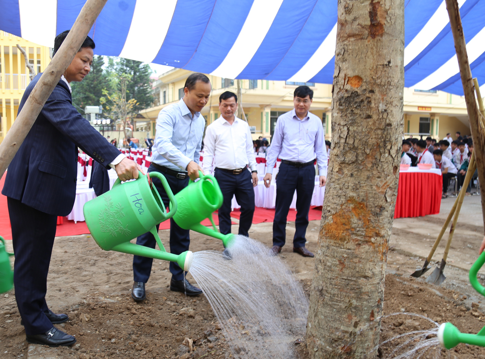 Đồng chí Mai Sơn và các đại biểu trồng cây trong khuôn viên Trường Trung học cơ sở Nguyệt Đức.