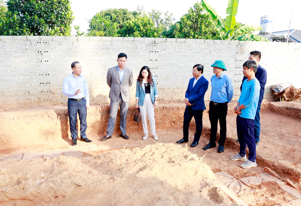 Đồng chí Mai Sơn kiểm tra địa điểm khảo cổ chùa Hoành Mô (xã Lạng Giang).