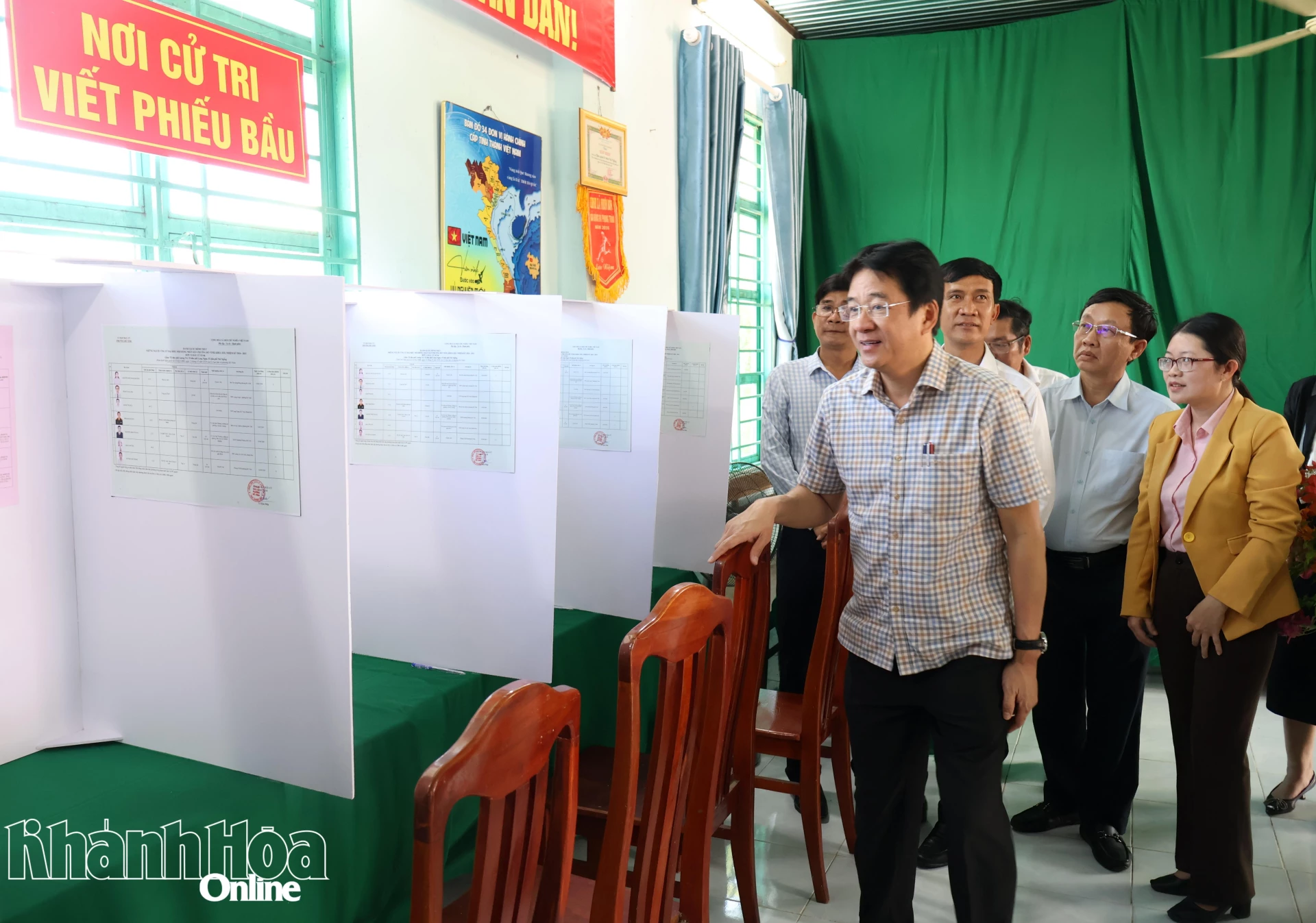Đồng chí Nguyễn Long Biên kiểm tra nơi cử tri viết phiếu bầu cử tại Khu vực bỏ phiếu số 19.
