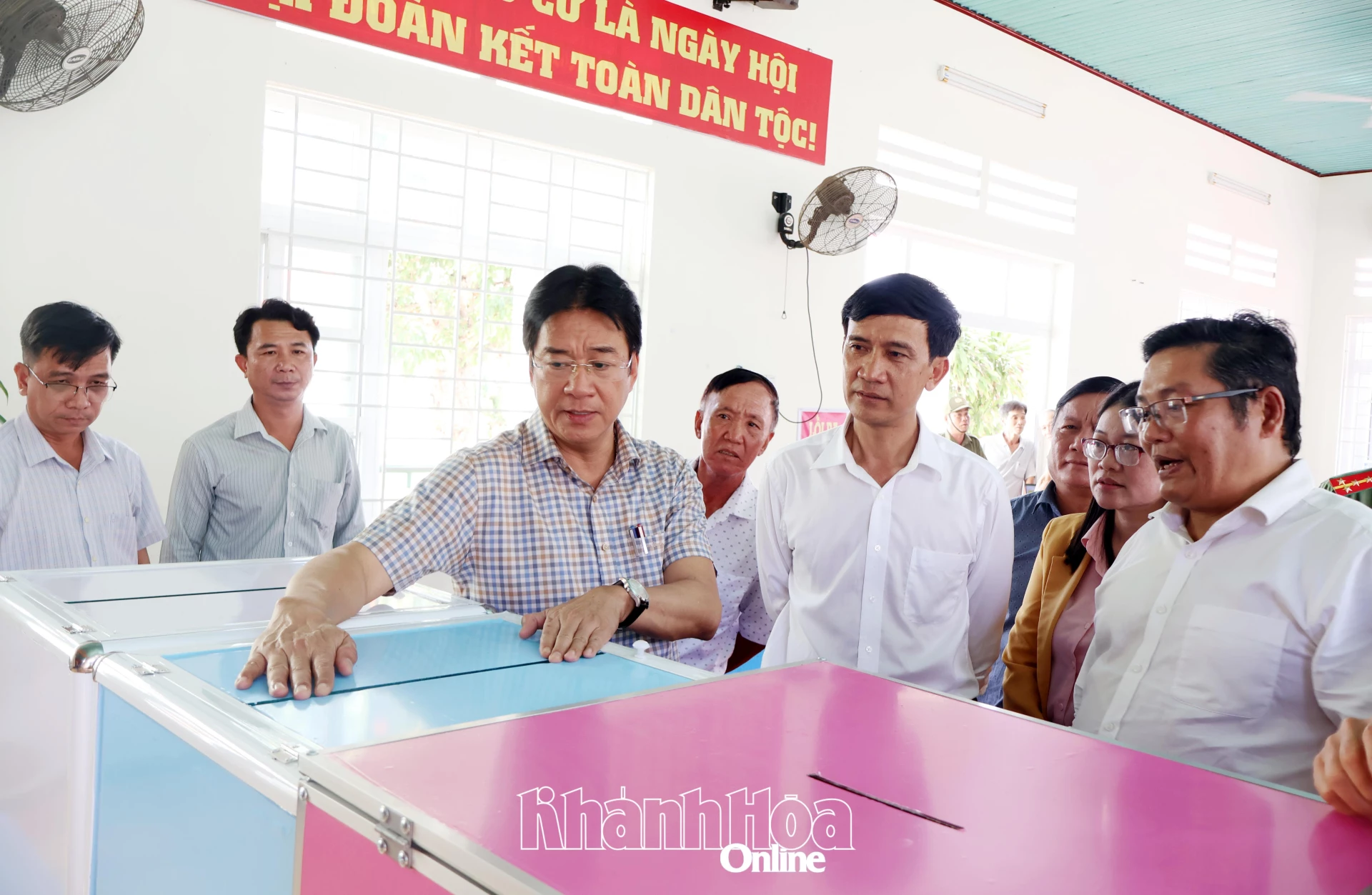 Đồng chí Nguyễn Long Biên kiểm tra hòm phiếu bầu cử tại Khu vực bỏ phiếu số 7.