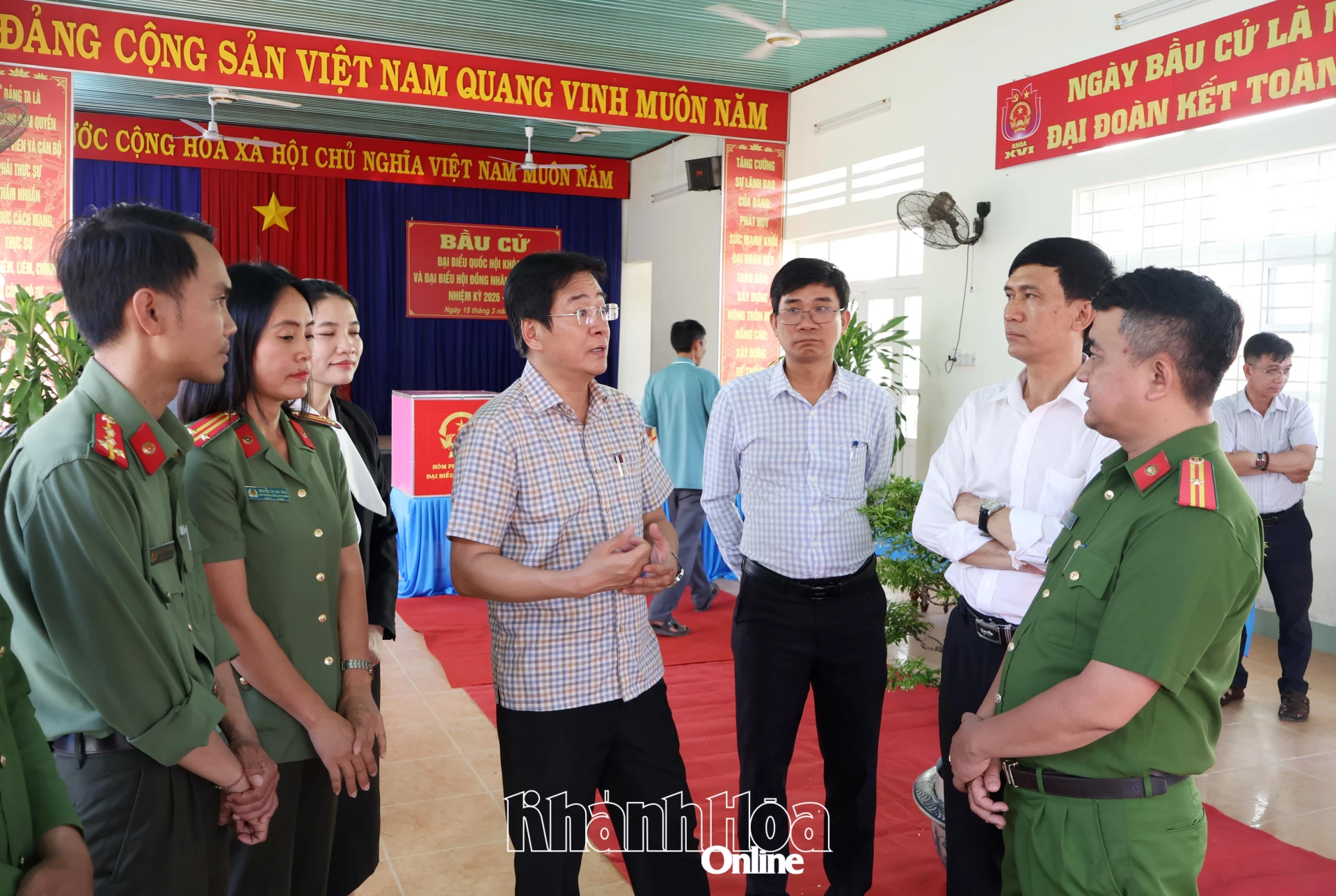 Đồng chí Nguyễn Long Biên trao đổi với lãnh đạo phường Đô Vinh và lực lượng công an làm nhiệm vụ tại Khu vực bỏ phiếu số 7.