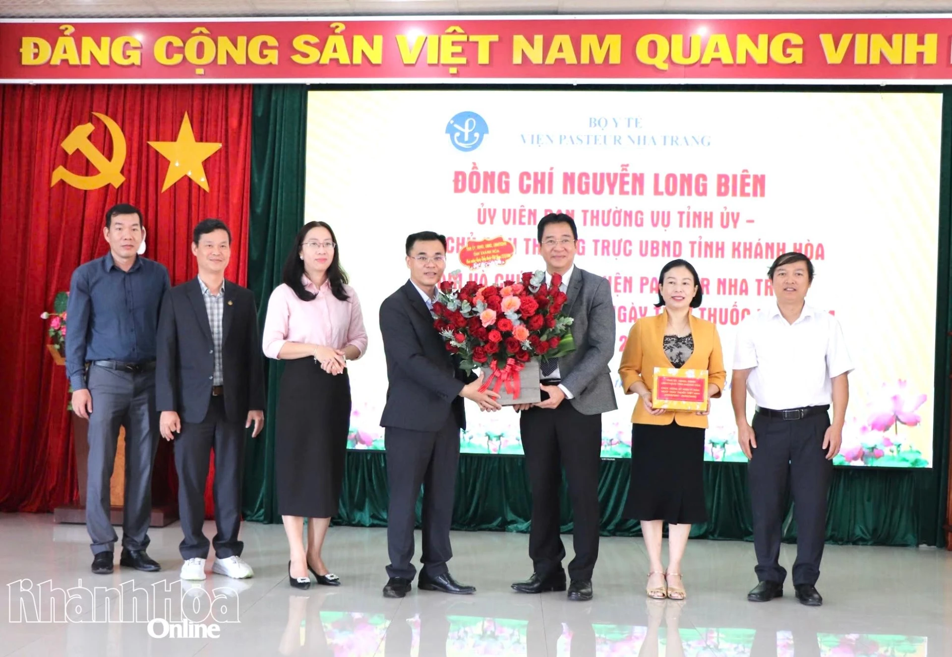 Đồng chí Nguyễn Long Biên tặng hoa chúc mừng lãnh đạo Viện Pasteur Nha Trang.